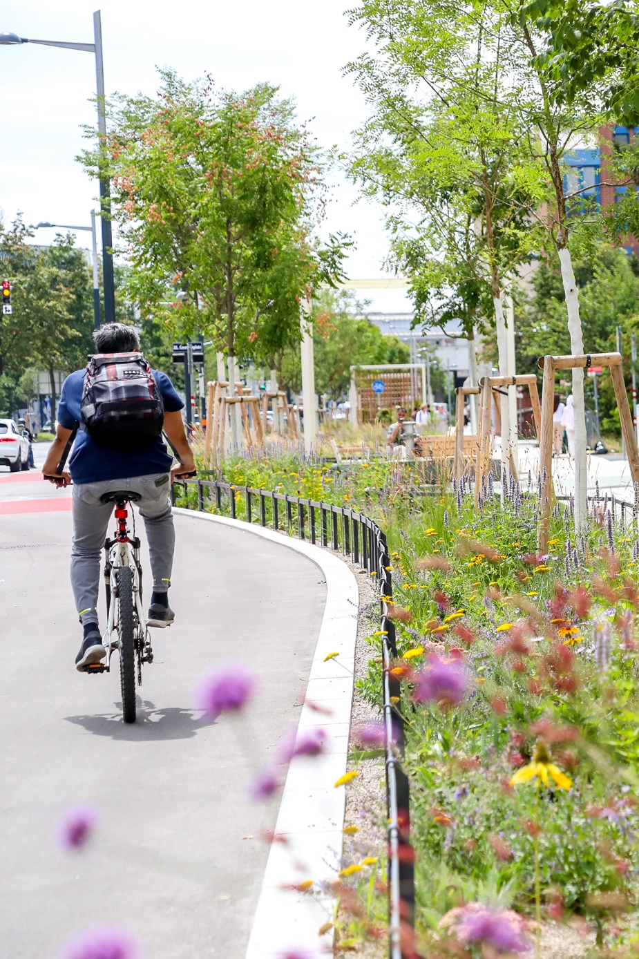 Podél cyklodálnice město odstranilo přes 30 000 m² asfaltu a vysadilo více než 16 000 m² zelených ploch včetně přibližně 200 stromů, které v létě lidem poskytují stín a ochlazují okolí. Tento přístup odpovídá městské strategii s motem „Pryč s asfaltem“, která kombinuje rozvoj dopravy s klimatickými opatřeními. Nová cyklotrasa propojuje celkem tři městské části a nabízí rychlé, pohodlné a bezpečné spojení pro denní dojíždění i rekreační jízdu.