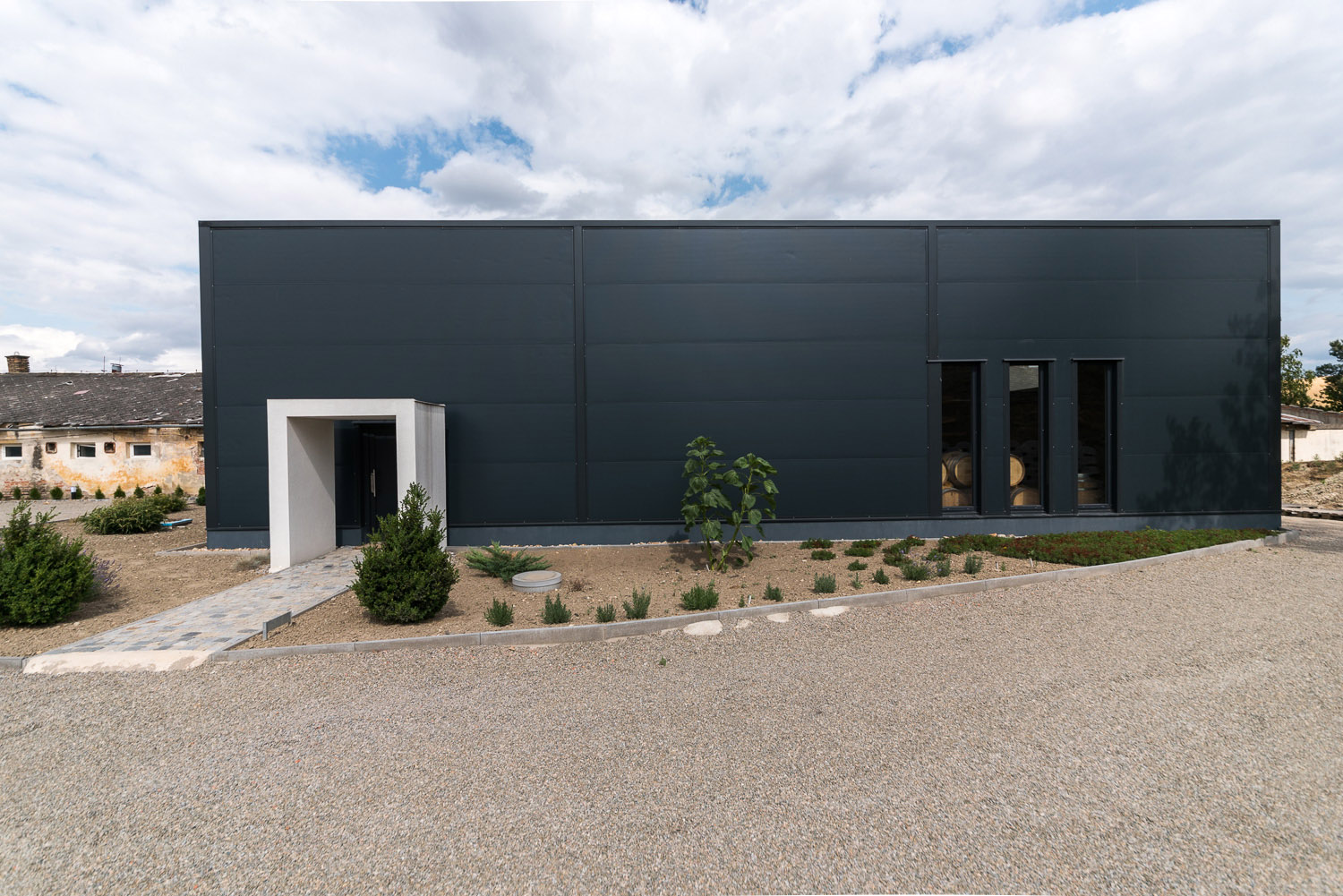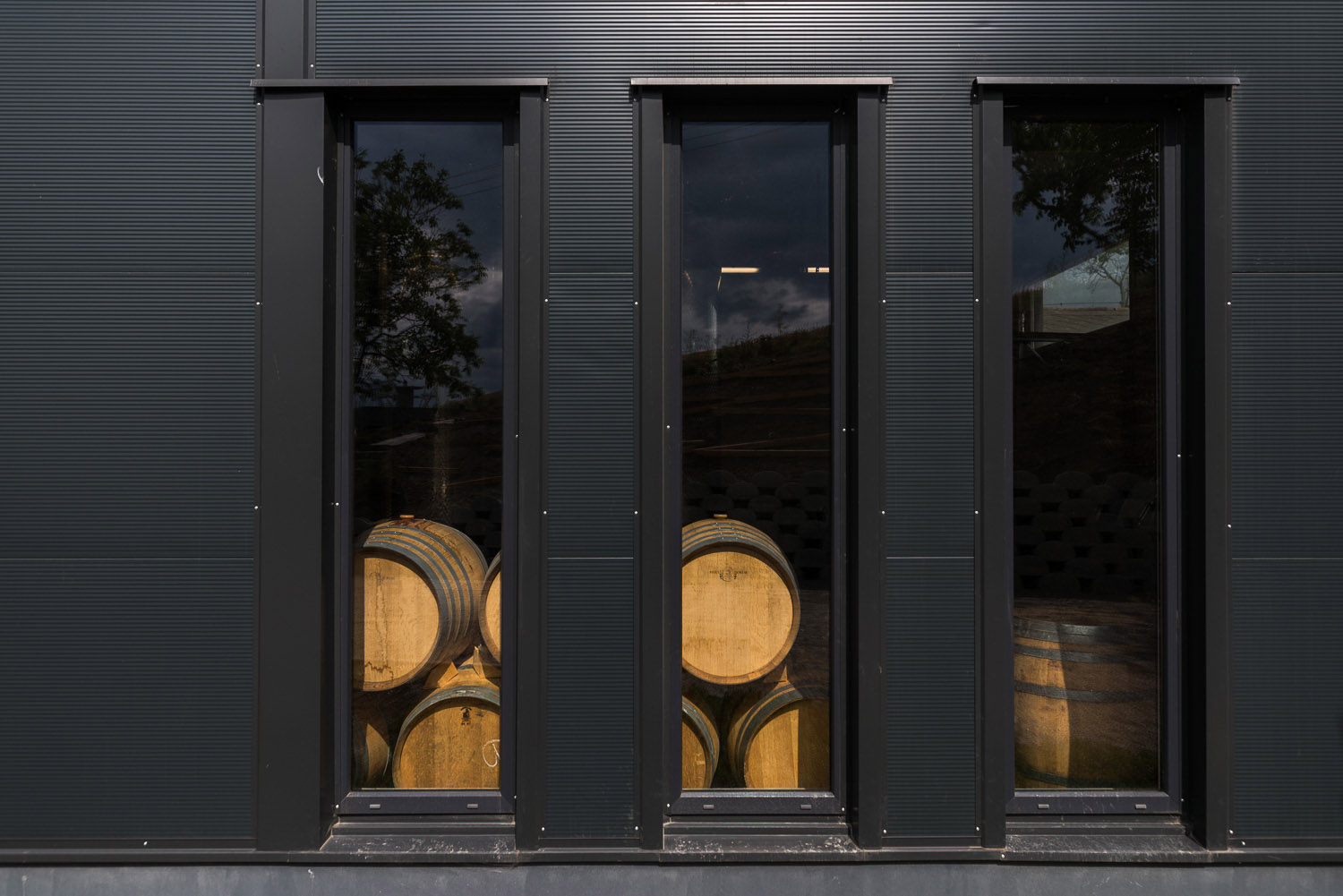 Zajímavými detail představuje okenní rastr, který odhaluje chloubu každého vinařství – barikové sudy. Za pozornost stojí i bíle vyvedený minimalistický portál.