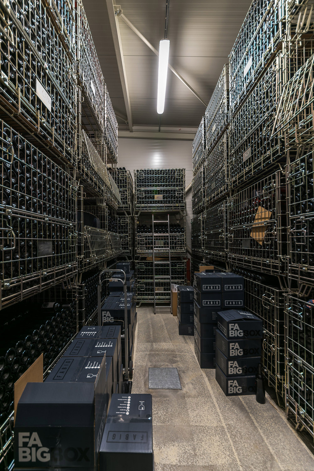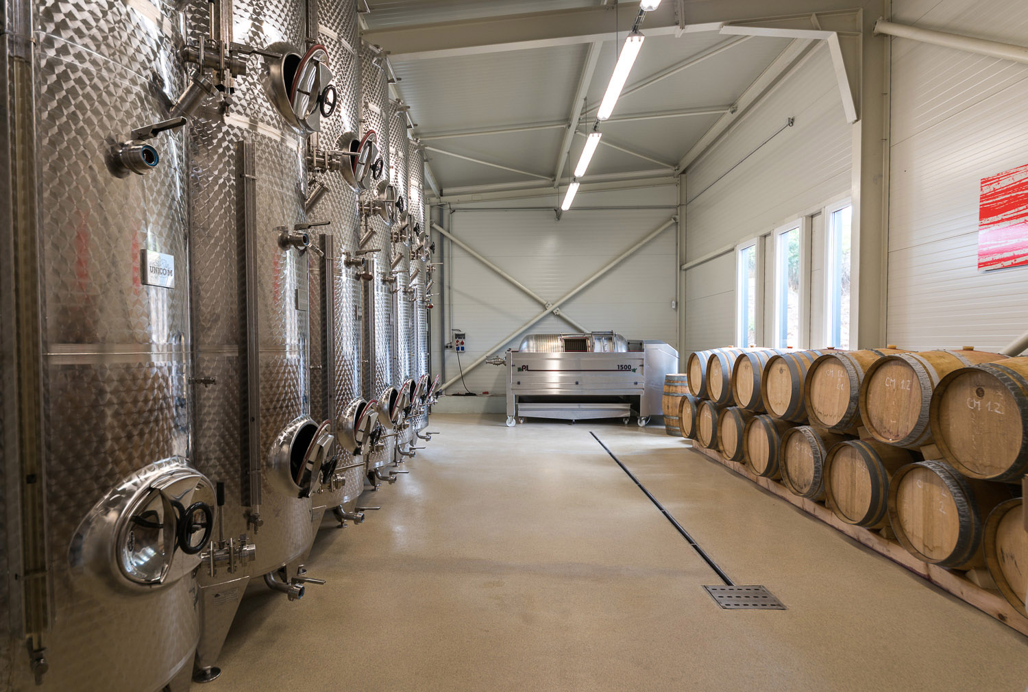 Halu tvoří ocelová montovaná konstrukce, podlahy pak epoxidová stěrka šedé barvy. Podlahy obsahují štěrbinový žlab nutný pro sanitaci sklepního hospodářství. Obdélníkový půdorys se člení do tří místností – ke vstupní místnosti určené pro degustaci, která slouží ještě jako menší kancelář, patří malá kuchyňka, úklidová místnost, šatna a WC. Největší prostor vybavený vraty pro vjezd techniky obsahuje technologie pro výrobu vína. Zbylou část tvoří klimatizovaný sklad vína, které je uloženo v ocelových „klecích.“