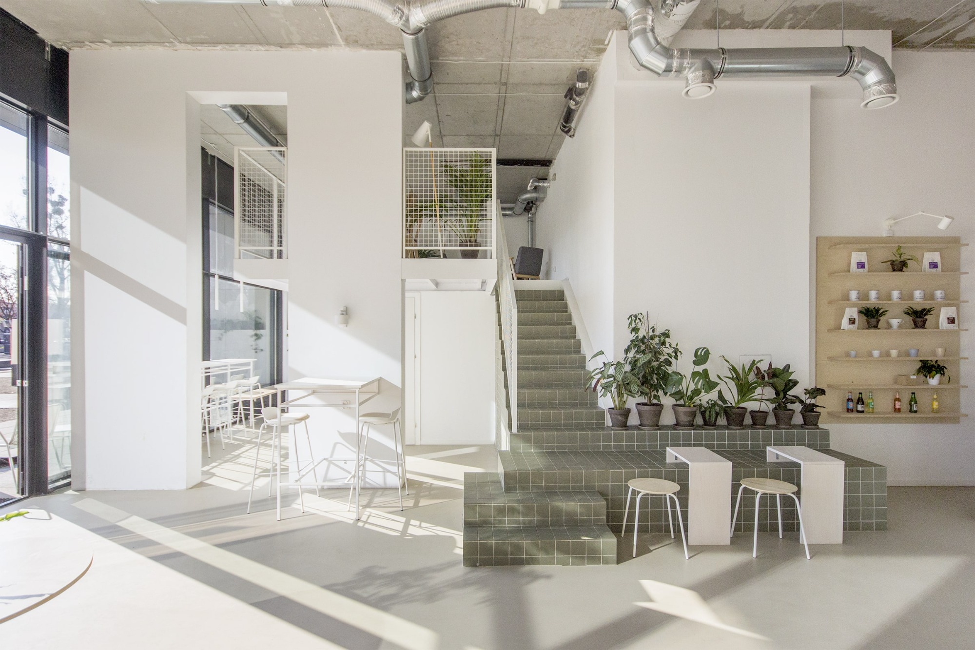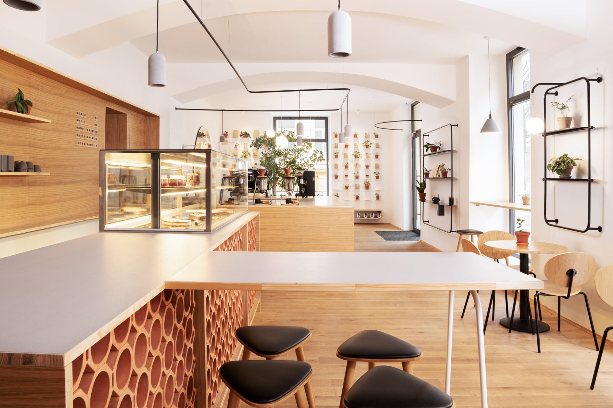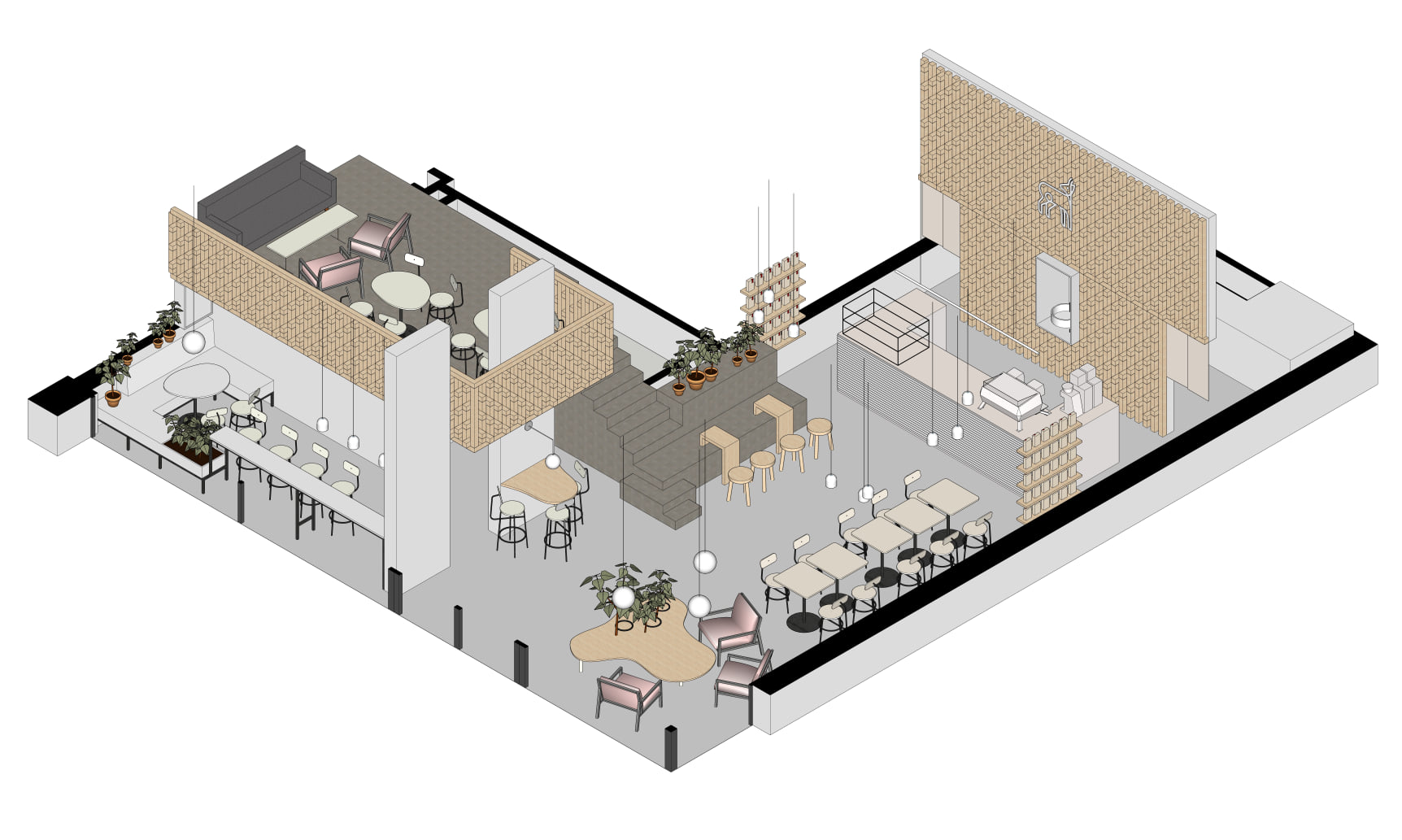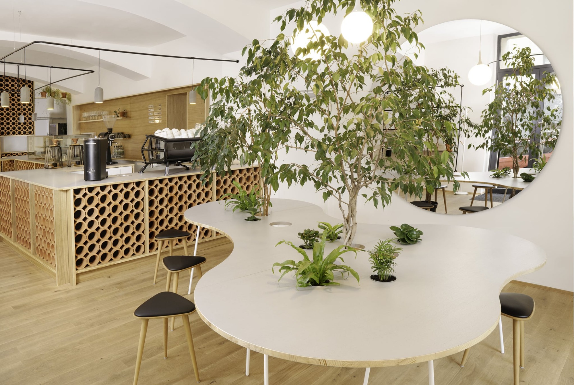 Při vstupu do kavárny jsou hosté vítáni ke společnému organicky tvarovanému stolu. U něj se ponořeni do integrované zeleně snadno zapojí do širší konverzace. Samotný bar byl navržen s respektem k odlišným funkčním zonám, díky kterým je hostům poskytnut nejen výhled na samostatně stojící kávový ostrůvek, ale také barové sezení táhnoucí se do hlavního prostoru. V zadní části kavárny je navrženo měkké sezení, které vytváří intimnější a uzavřenější prostor - ideální pro větší skupinky lidí, které mohou sedět odděleně a nerušeně od zbytku kavárny.