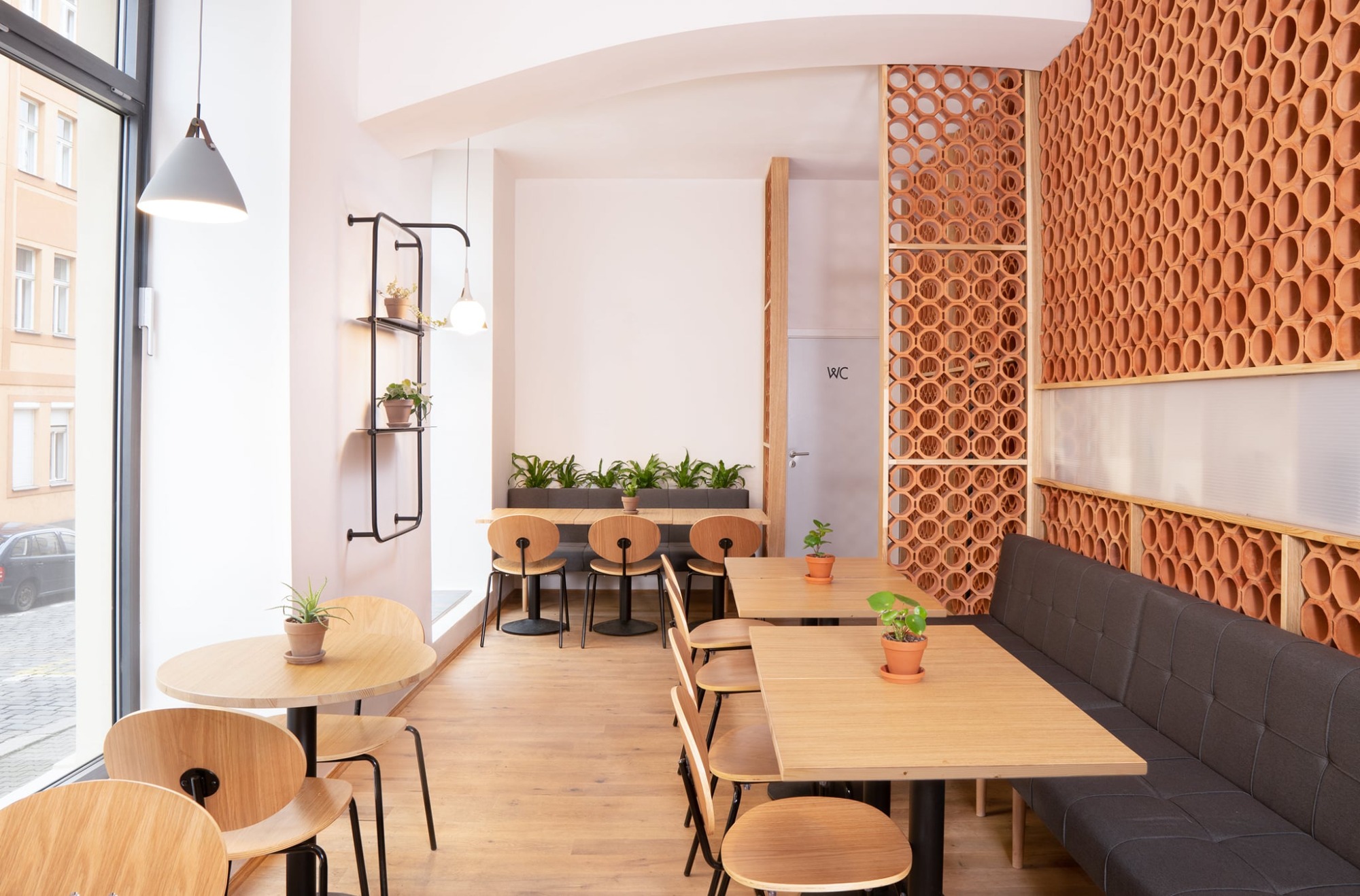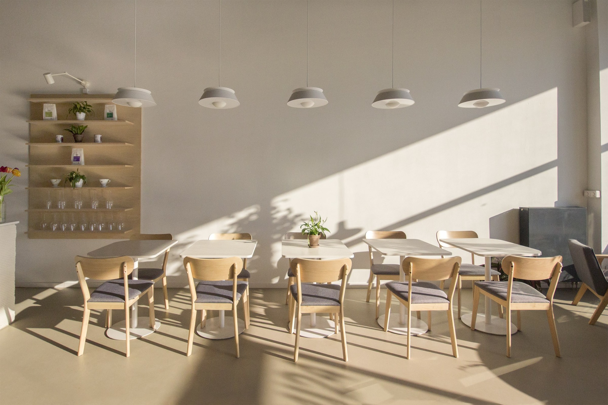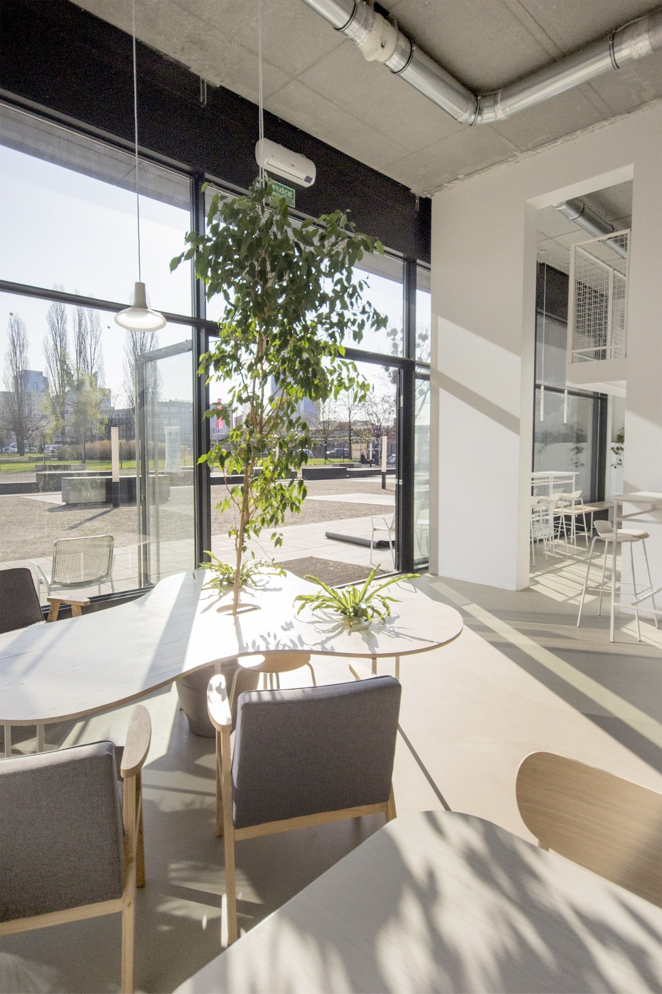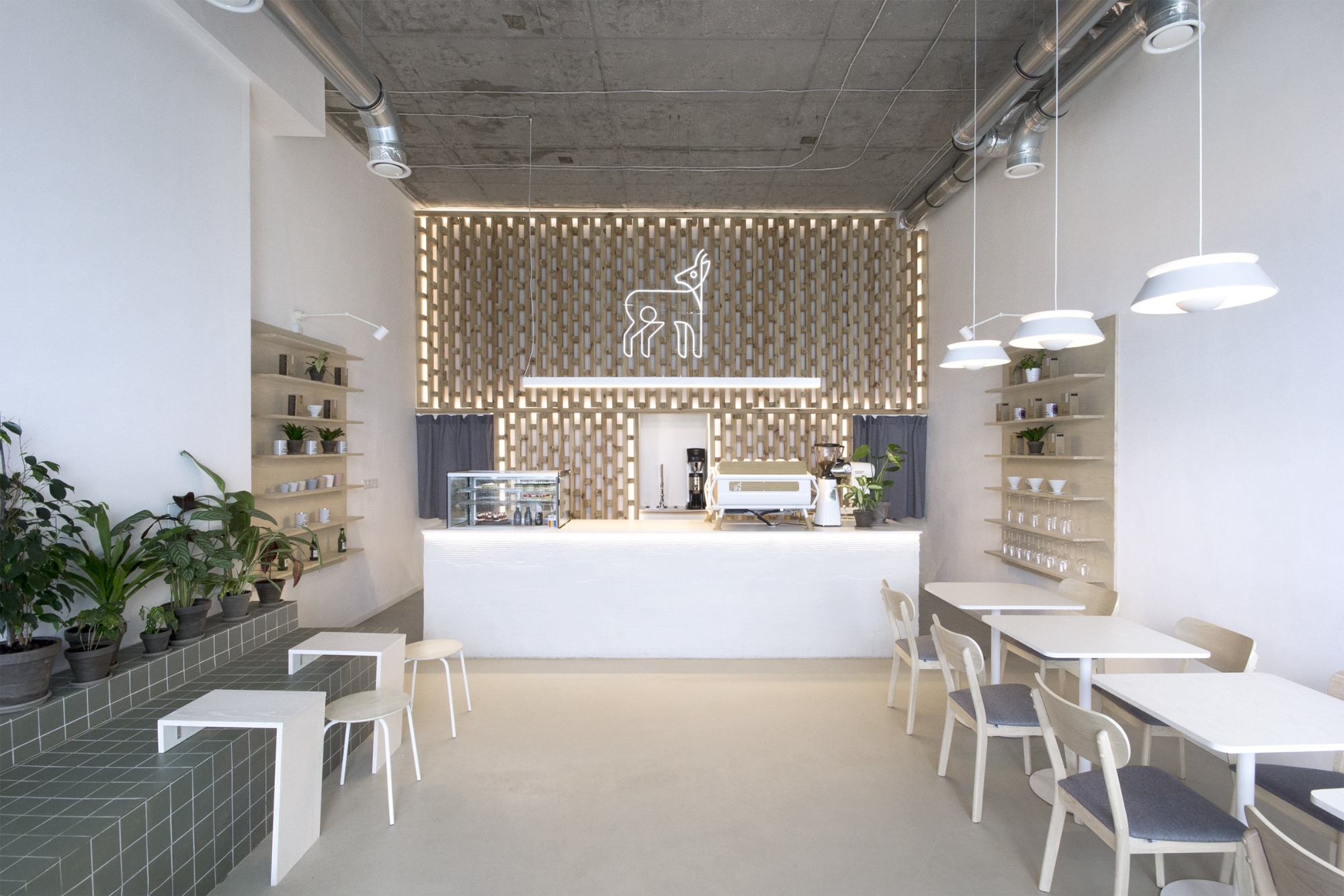 Při vstupu do kavárny jsou hosté vítáni ke společnému organicky tvarovanému stolu. U něj se ponořeni do integrované zeleně snadno zapojí do širší konverzace. Samotný bar byl navržen s respektem k odlišným funkčním zonám, díky kterým je hostům poskytnut nejen výhled na samostatně stojící kávový ostrůvek, ale také barové sezení táhnoucí se do hlavního prostoru. V zadní části kavárny je navrženo měkké sezení, které vytváří intimnější a uzavřenější prostor - ideální pro větší skupinky lidí, které mohou sedět odděleně a nerušeně od zbytku kavárny.