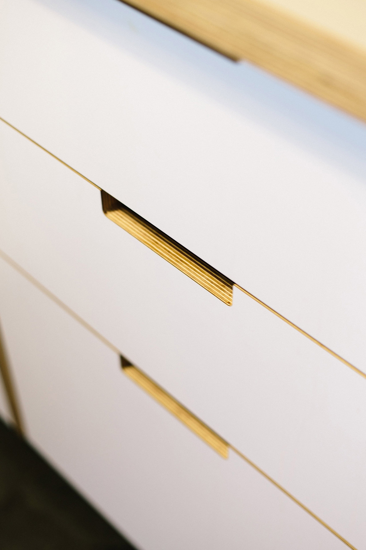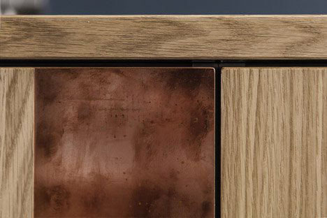 Dubová dýha je nakombinovaná s mědí, v druhé verzi jsou ocelové pásky nastříkány na bílou či černou, aby šly k dvířkům.
