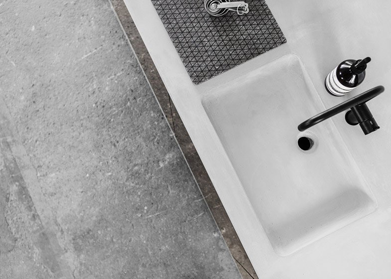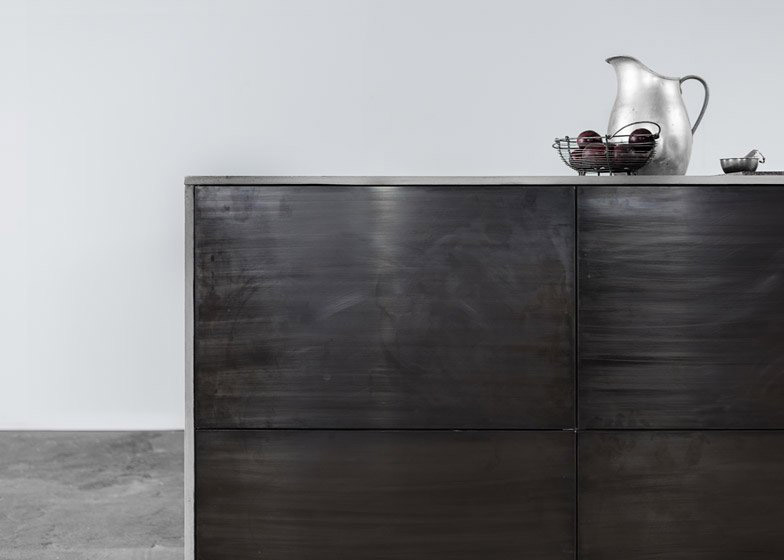 Materiál horní pracovní desky – k dispozici z betonu vystuženého vlákny, z tombaku (slitina mědi a zinku) s bronzovou barvou, dubové dýhy, nebo nakouřeného dubu – je použit také na bocích.