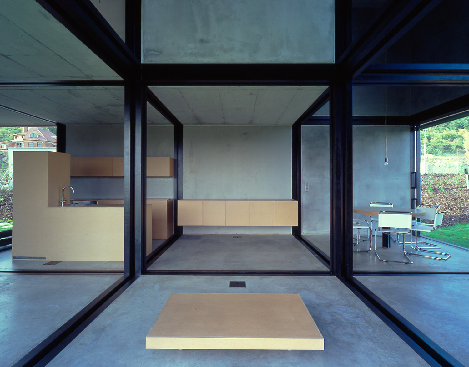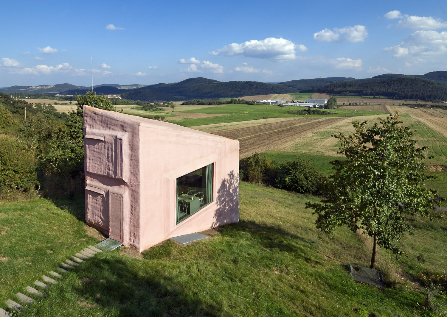 Je to dáno tím, že je celý pozemek orientovaný severně, z obývacího pokoje vidíte do údolí, ale nemáte jižní světlo. To chytáme kukátkem či periskopem v horní části. Ložnice a další místnosti mají jižní nebo východní světlo. Mým cílem bylo dostat jižní osvětlení i do obývacího prostoru a proto je dům takto deformovaný a převýšený. Na první pohled může působit stavba iracionálně, nebo že je sochařským dílem, ale základ dispozičního řešení je čistě racionální. Půdorys vychází z kruhu, který je na jižní straně rozdělen do dvou čtverců, tak aby vznikly pravé úhly pro kuchyni, koupelnu a pokoje.