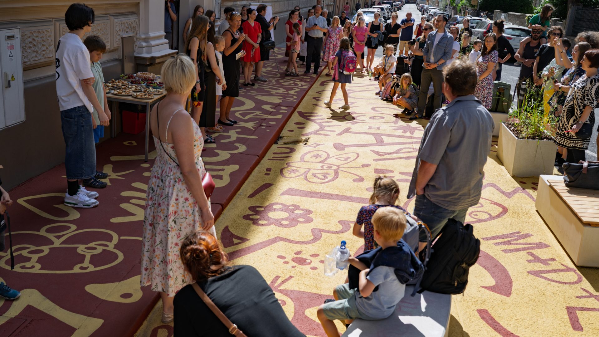 V případě Grafické ulice, která nemá příhodný název jen tak, navíc umění navazuje na historii místa. „V Grafické ulici totiž kdysi sídlily grafické závody Václava Neuberta, významného prvorepublikového tiskaře a nakladatele. Výtvarný návrh proto pracuje s písmeny, číslicemi a kartografickými symboly. Na jejich podobě se podílely samy děti ze školy, které je i kreslily,“ uvedl spolek Pěšky městem.