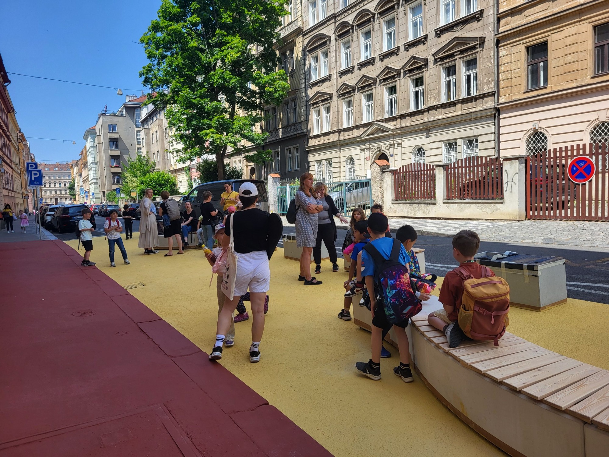 Místo, kde se dříve nevyhnuli ani dva lidé, a nároží křižovatky, kde často nelegálně parkovala auta, se změnily ve velkorysý, mnohem bezpečnější prostor s venkovním mobiliářem. Slouží tak konečně daleko více dětem a chodcům než řidičům. Děti mají nově možnost se před budovou potkávat, trávit spolu čas, čekat na kamarády nebo tramvaj. Prostor využívaly už ve chvíli, kdy ještě ani neyl dokončený.