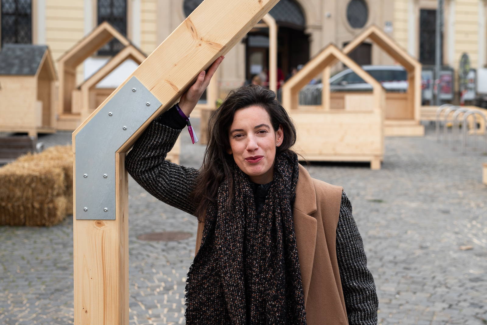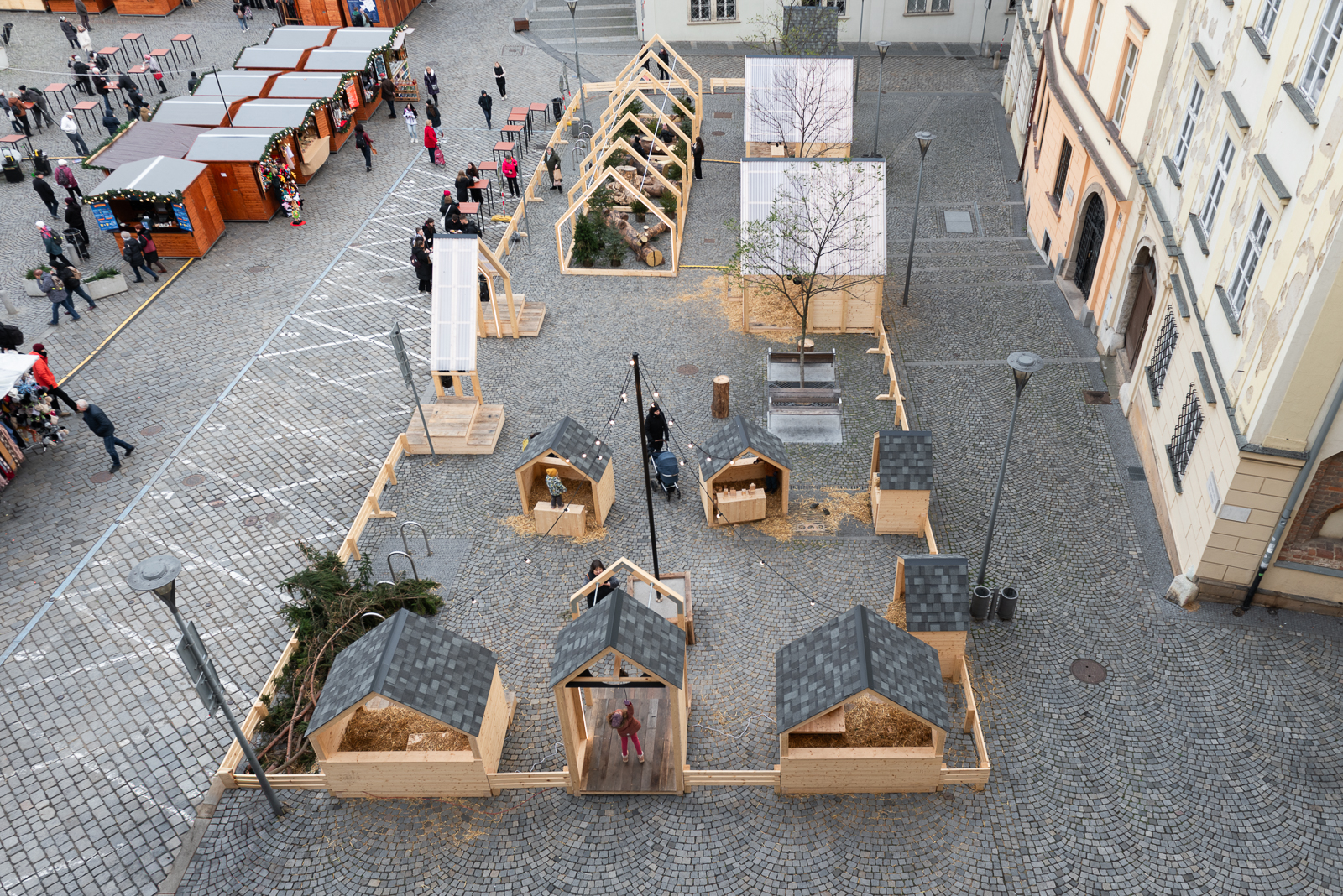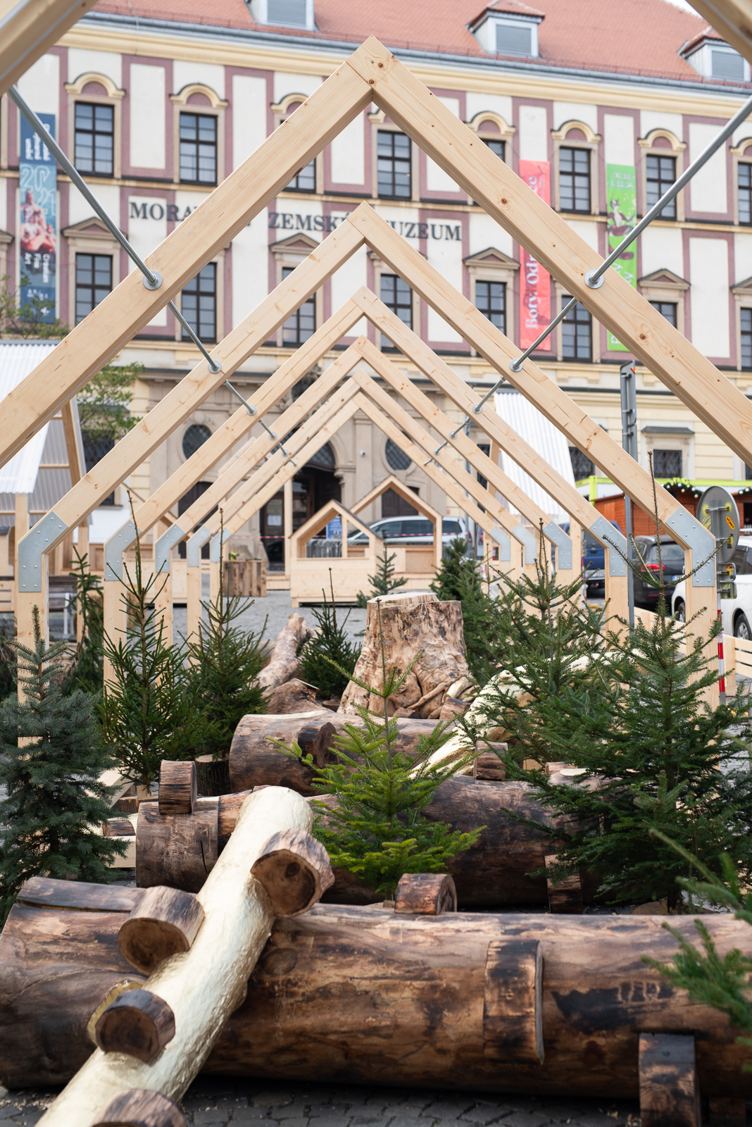 Když Brňanům čouhá sláma z bot. Na Zelném trhu vyrostla vánoční vesnička s přírodními prvky podle návrhu Consequence forma architects