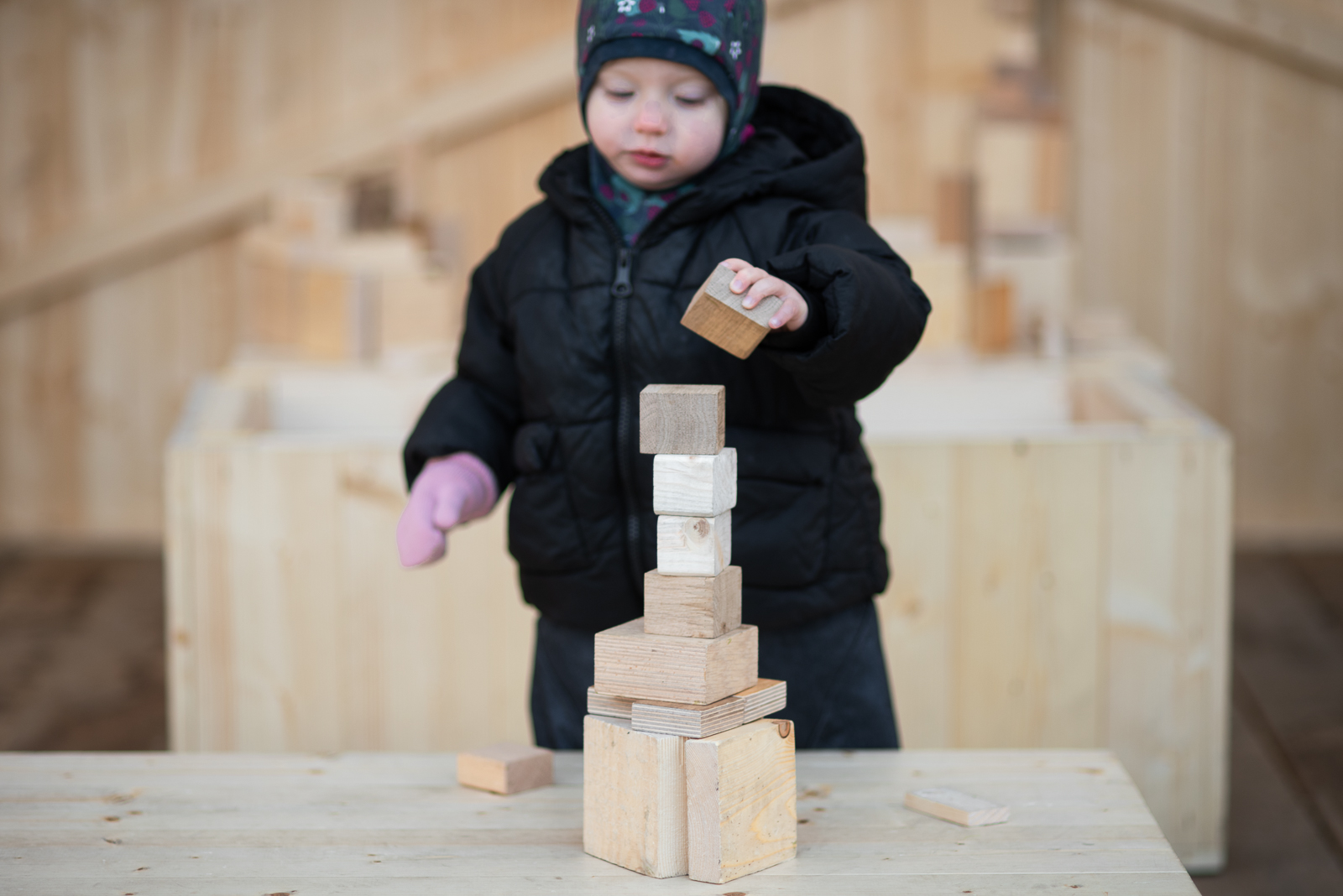 Stávající stromy s lavičkami doplnili Consequence forma architects o dětskou dílnu vybavenou dřevěnými kostkami pro stavění pyramid. Domečky jsou z jedné strany otevřené, a tak mohou připomínat betlém, který je minimalisticky vybaven slámou a velkými kostkami pro lezení a skoky. Největší dřevěnou konstrukci nazvanou Stodola vyplňuje les a mystická instalace Zlaté dřevo od sochařky Veroniky Plátkové.