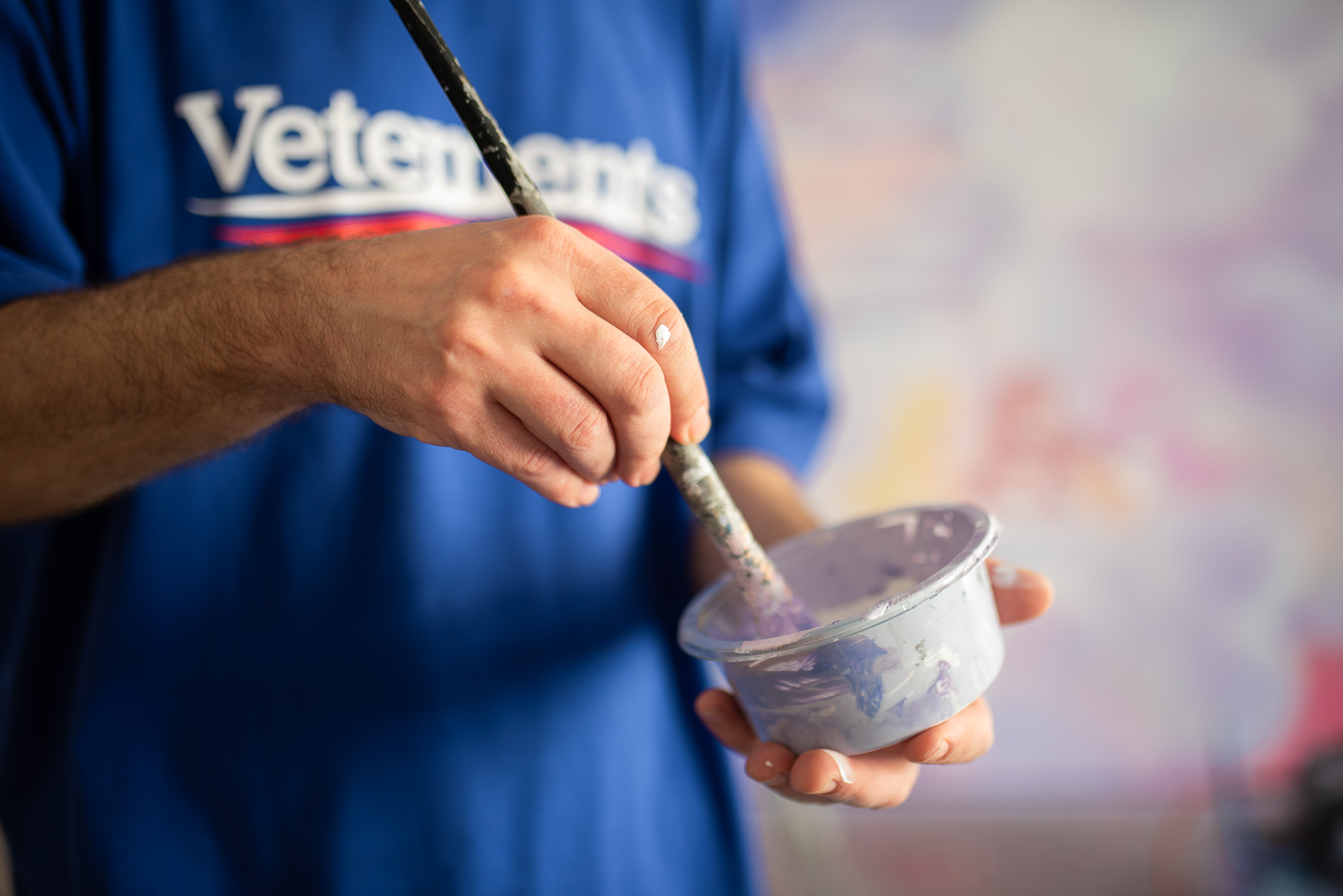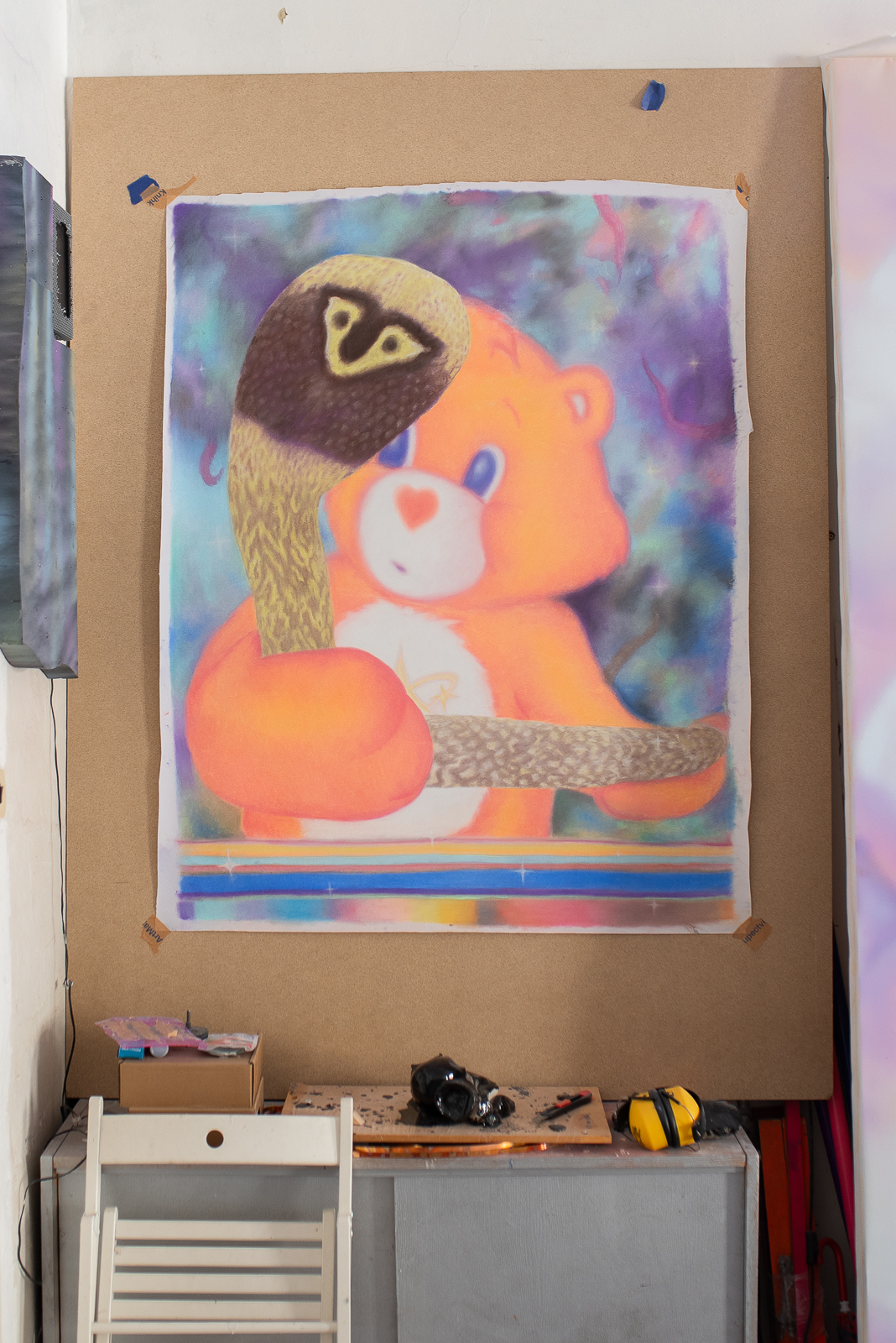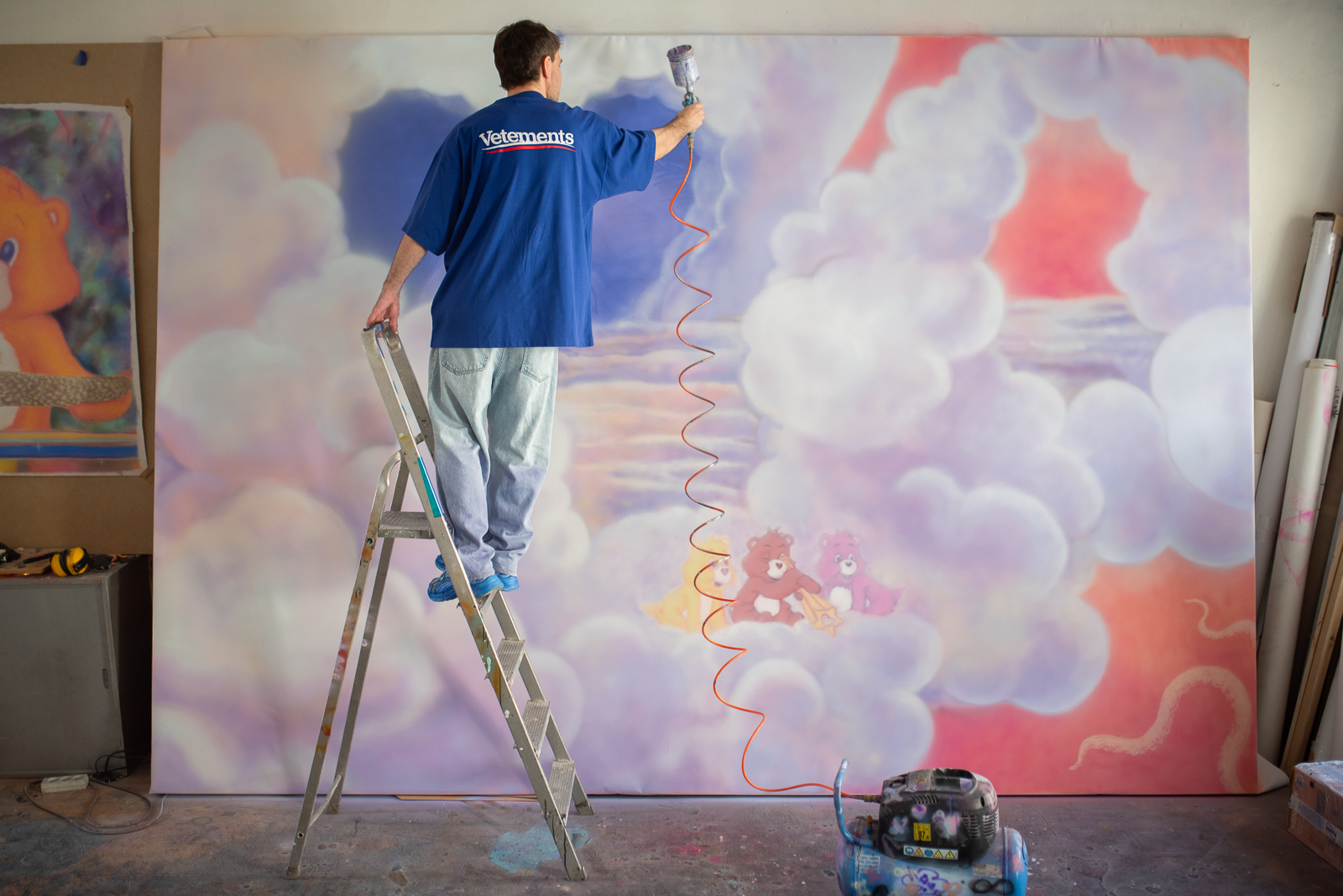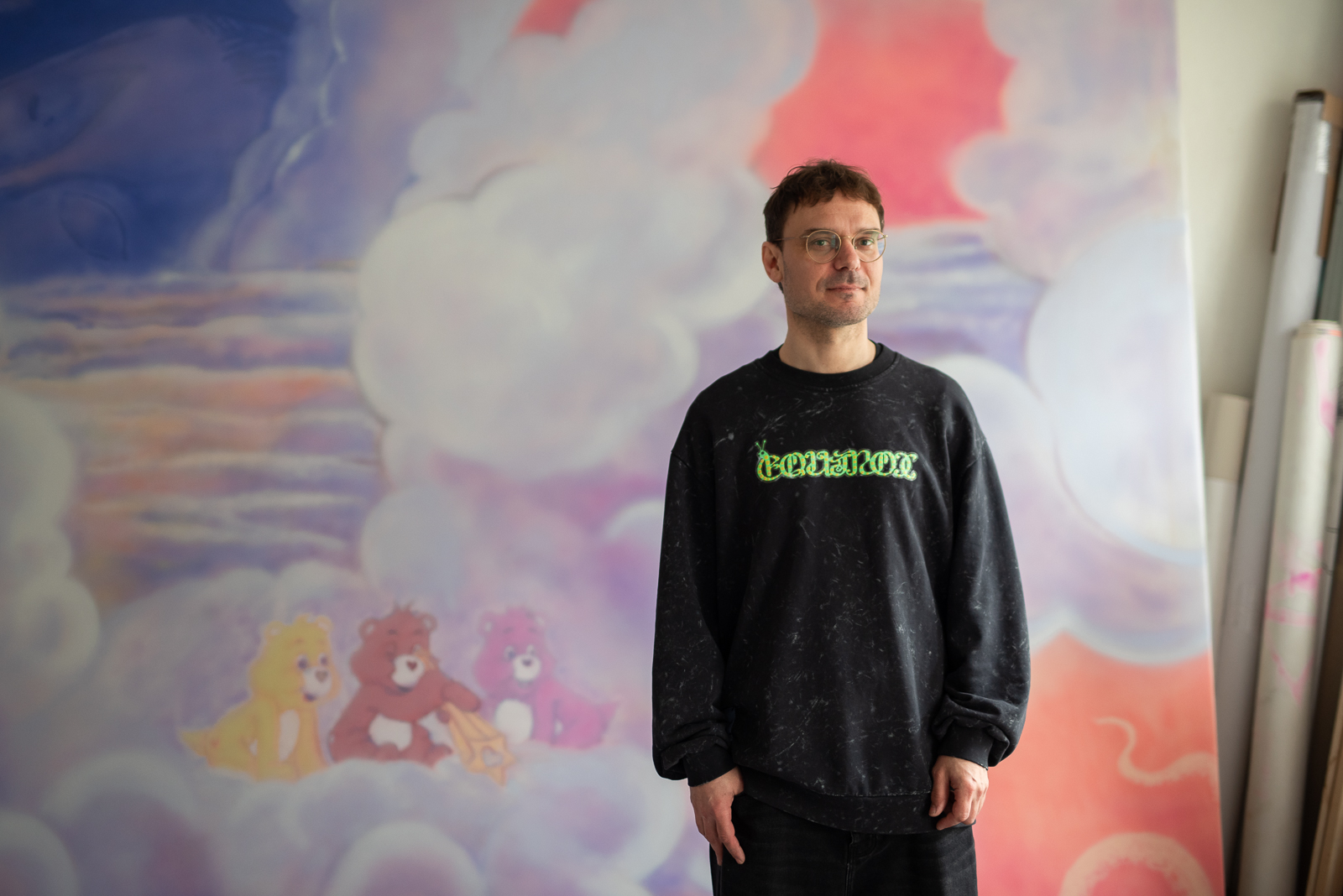 V ateliéru právě dokončujete velkoformátový obraz s obláčky, hlavou múzy a Care Bears. S čím jste se do něj pustil?