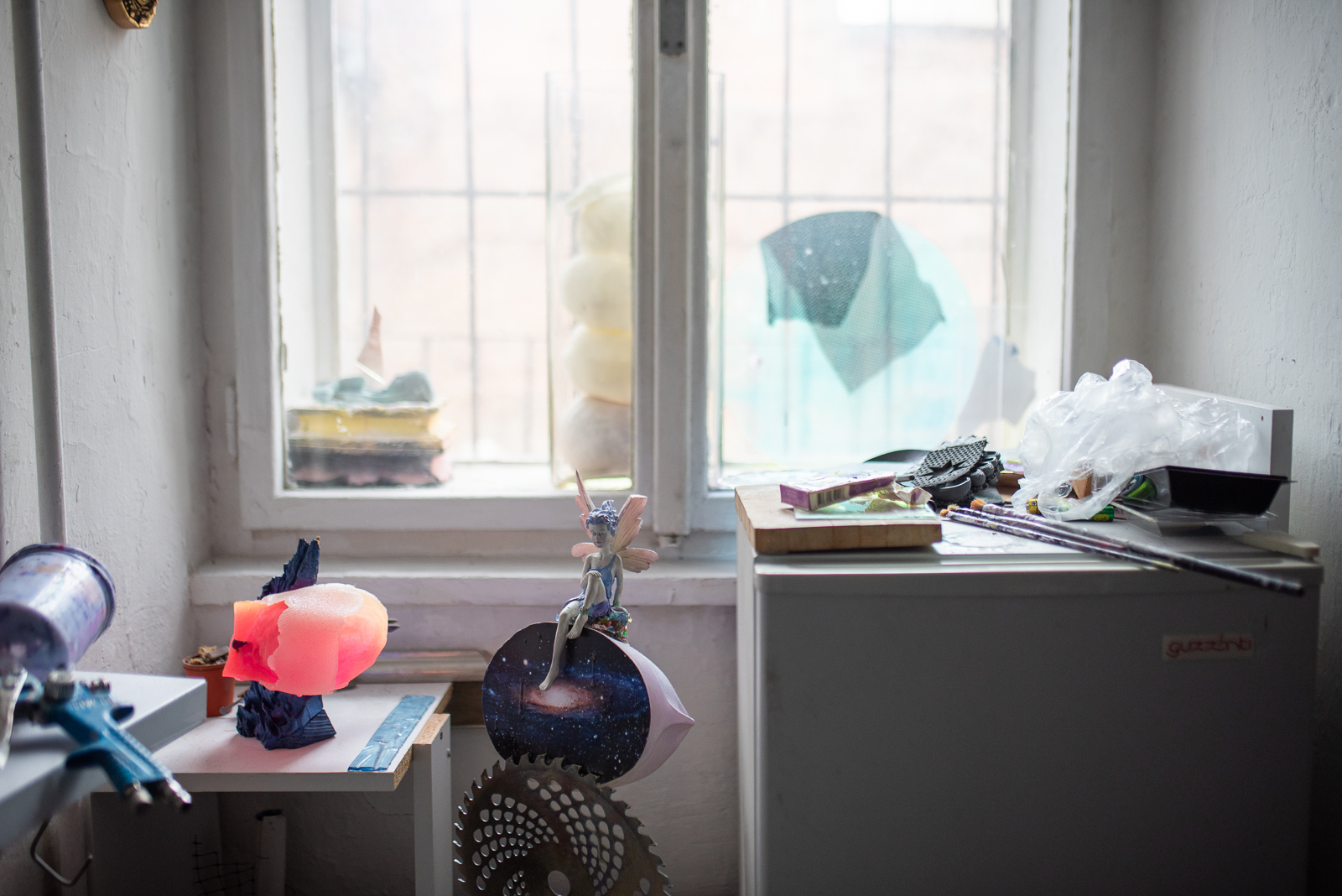 V ateliéru vznikají spíše nápady toho typu, co spojit s čím, a podobně, ale jinak se dá říci, že pracuji neustále. V hlavě. Pozoruji věci kolem sebe, přemýšlím, když jdu po ulici, před spaním, ve vlaku, v kině…