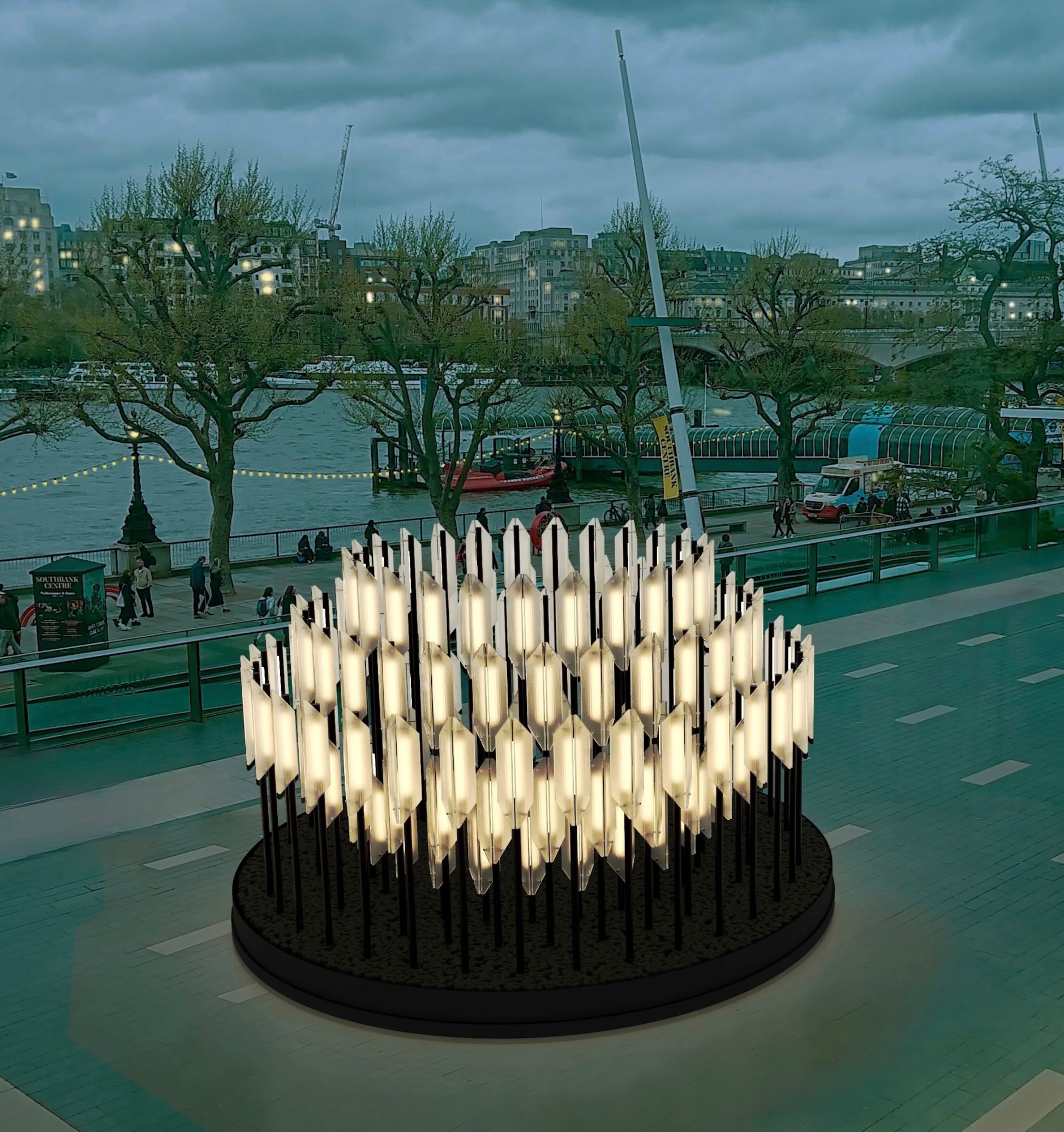 Jednadevadesát kovových podstavců nese svítidla z recyklovaného skla. Jejich estetika si bere inspiraci z viktoriánského pouličního osvětlení konce 19. století, zároveň vede dialog s brutalistní architekturou, která je pro tento břeh Temže typická. V každém skleněném stínidle vyrobeném z Brokisglass je patrný i otisk baltské borovice, která zdobí betonové zdi galerie.