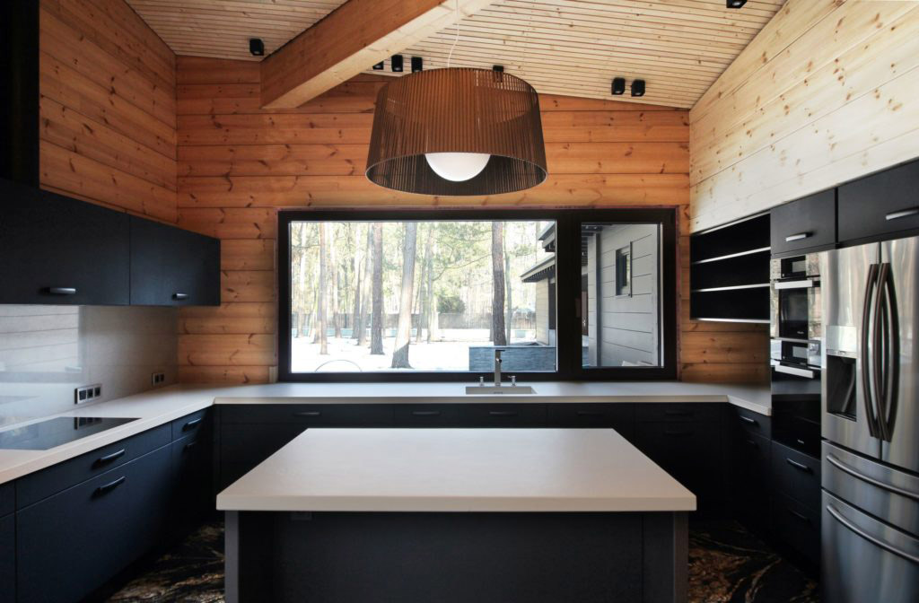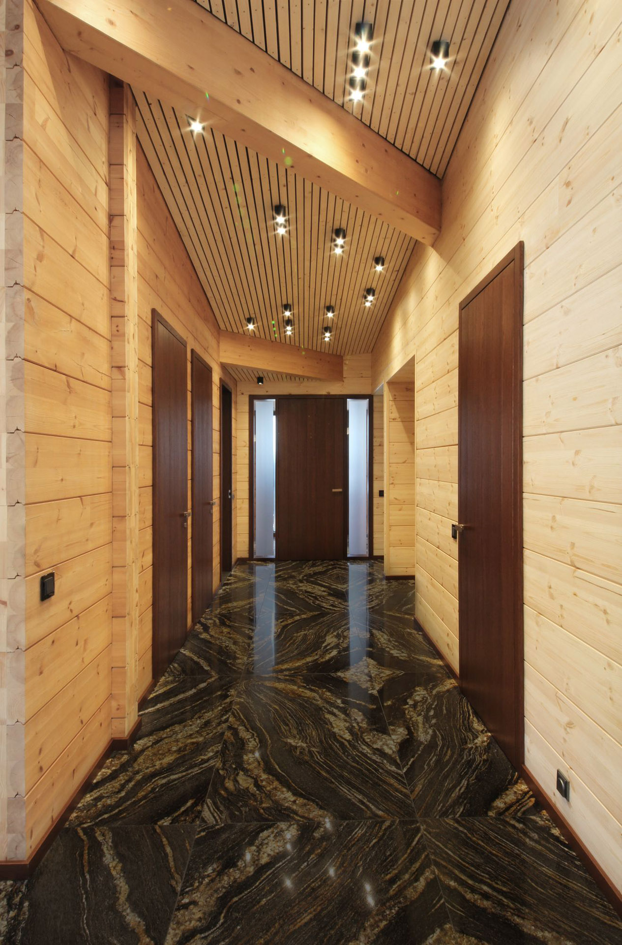 Stěny, střecha a terasy jsou dřevěné, velkou většinou z finské borovice. Profil klád je zkonstruován tak, že není třeba brát v úvahu tzv. sedání stavby vlivem sesychání materiálu. Podlahy jsou z vícevrstvých dubových panelů nebo z kamenné dlažby. Všechny dveře jsou dubové, okna dřevohliníková, střecha z titanzinkového plechu. Sokl objektu, záhony a těleso vnějšího komínu jsou obloženy kamennými pásky.