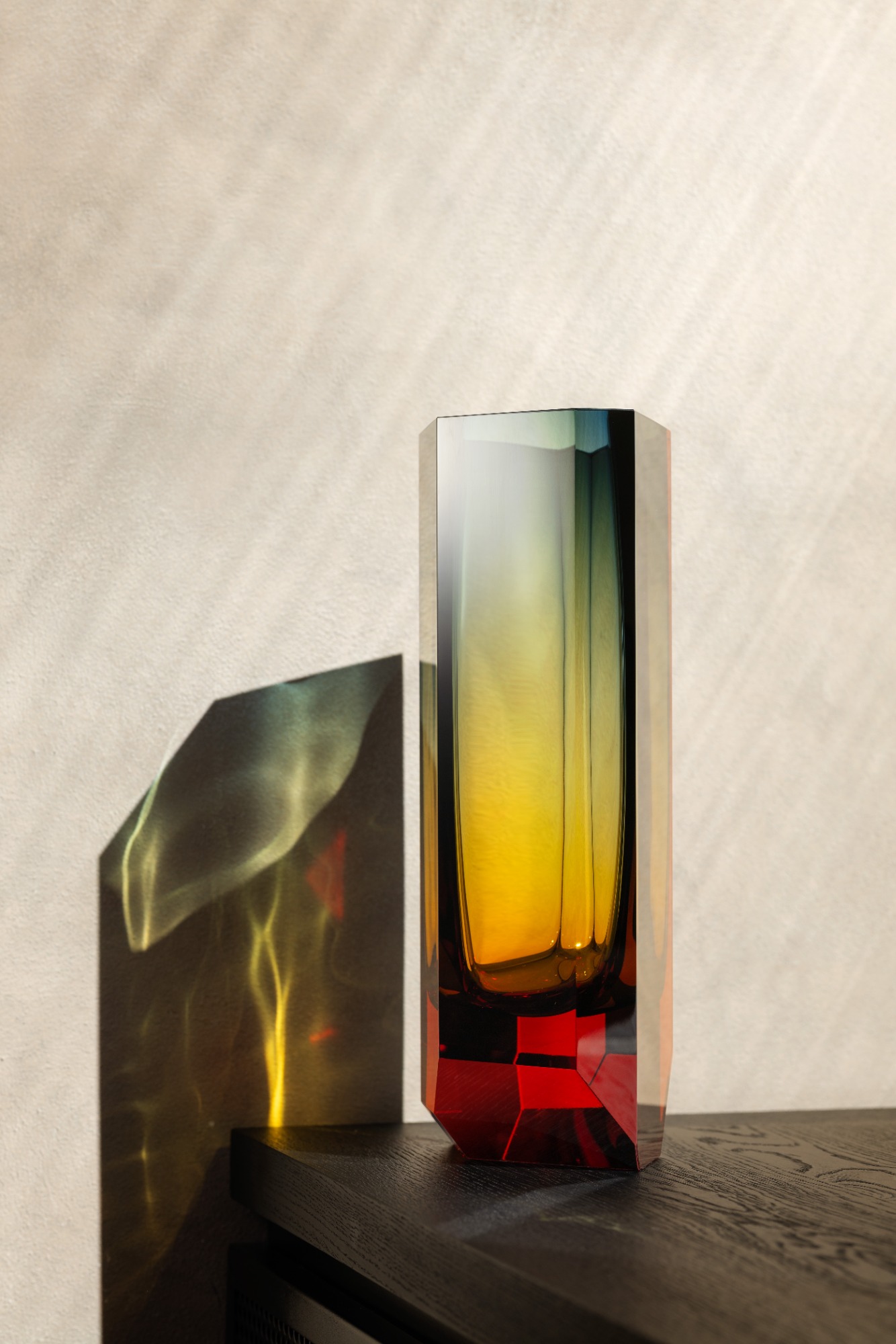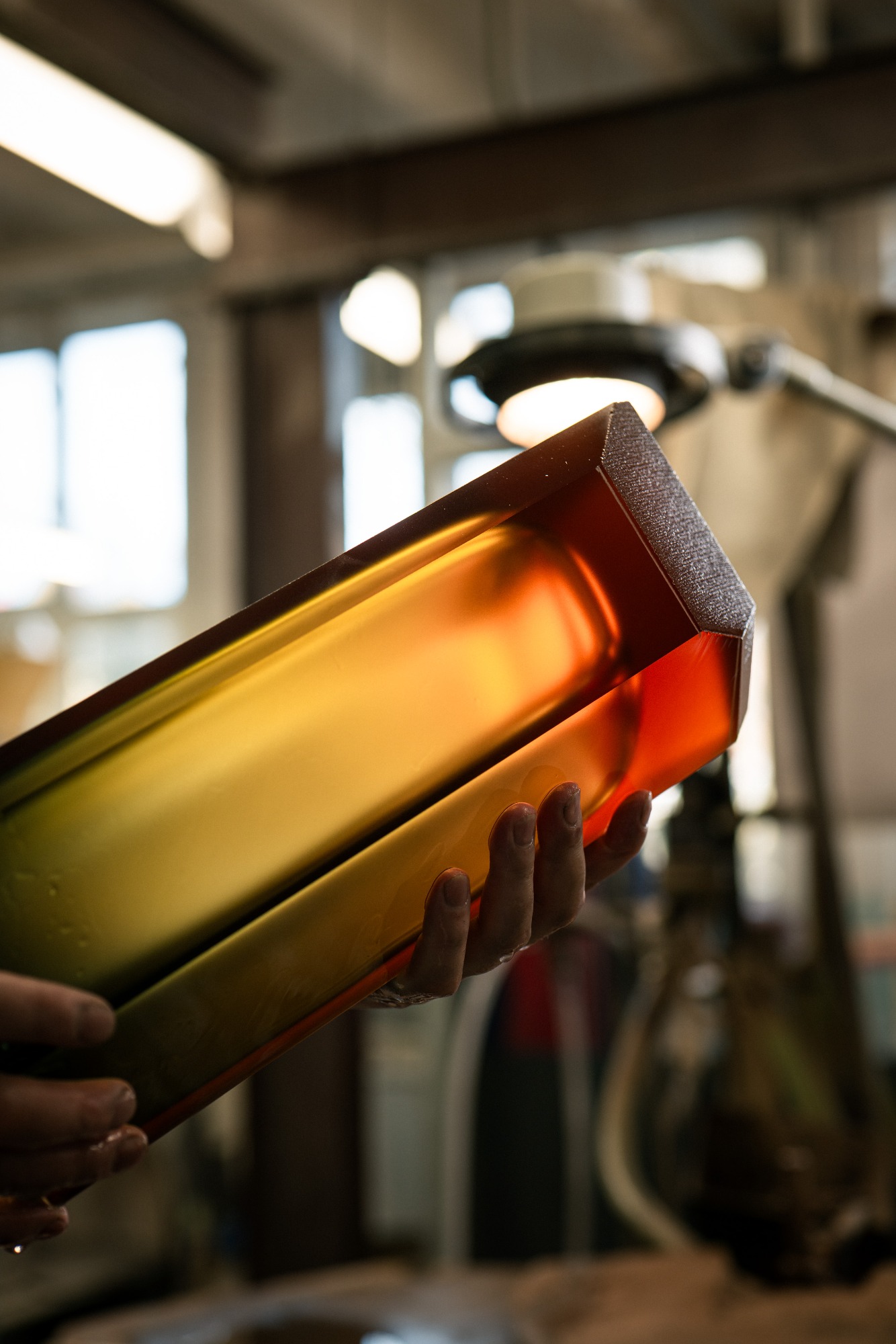 Stejně jako brutalistní stavby na první pohled upoutají svým objemem podpořeným strohou formou, i vázy Magnus nechávají vyniknout materiál pomocí jeho skulpturální proporce. Tu dobře zvýrazňuje také barevnost vycházející jednak z palety typické pro interiéry 60. a 70. let, jednak ze samotného středobodu Moseru. Ve sklárně známé svou charakteristicou škálou odstínů došlo v tomto případě k vůbec prvnímu spojení topasu a modré, díky čemuž vznikl nový žlutozelený odstín s kouřovým nádechem. Barvy se vrství tradiční technikou podjímání, každý kus je proto originál.
