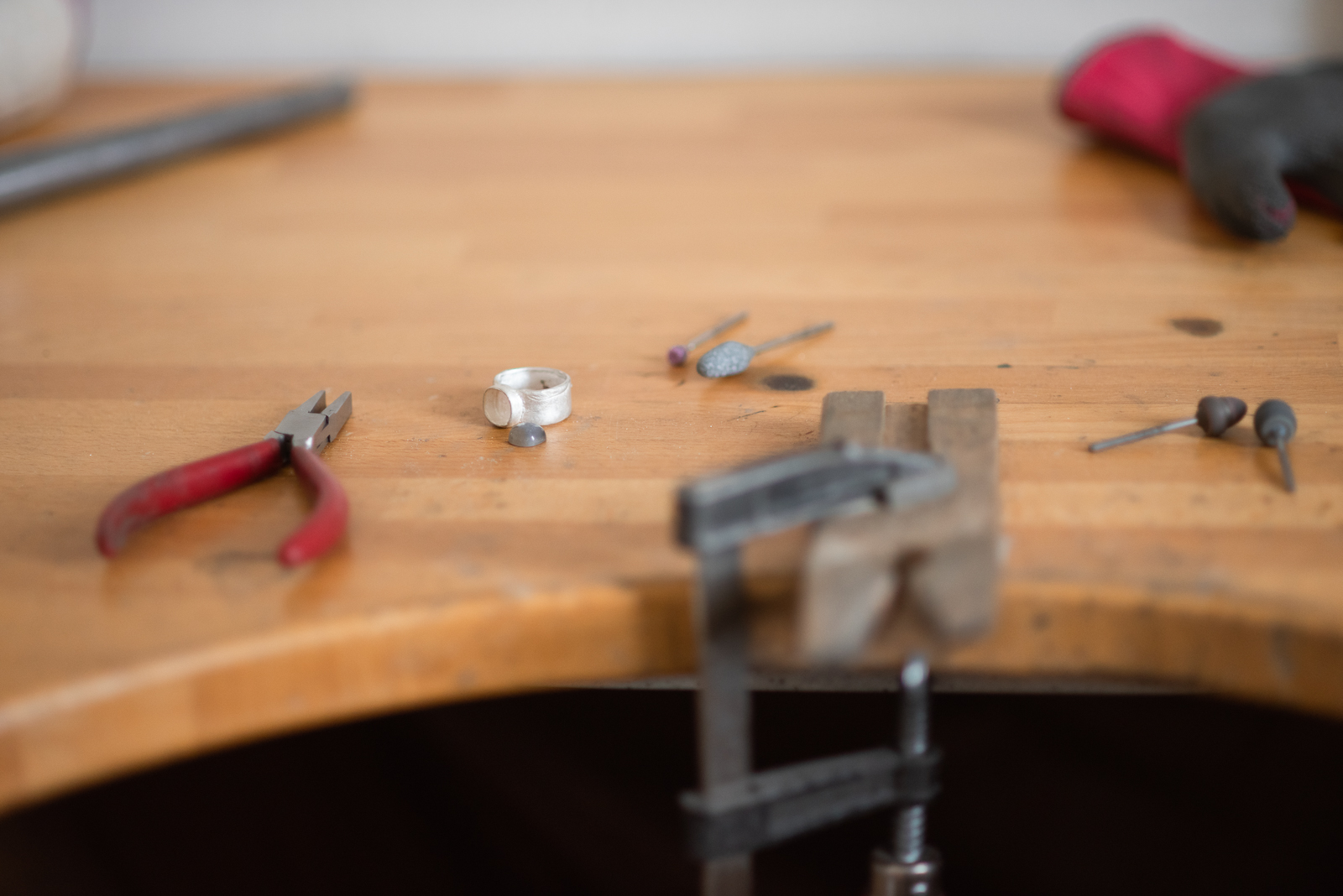 Moje dílna vyžaduje hlavně toleranci ke špíně a prachu, který produkuju. Momentálně mám takovou skromnou dílnu doma, v malém pokojíku. Vzhledem k tomu, že většina mých výrobků je odlévaných pomocí metody ztraceného vosku, velká část práce spočívá v modelování z vosku. Já sama neodlévám, to si nechávám dělat, nicméně odlitky následně opracuju doma. Potřebuju mikromotor, lešticí stroje, ty dělají největší binec. Ale naštěstí nezaberou moc místa. Tím, že využívám metodu ztraceného vosku, mi odpadá spousta strojů, které mají místo v tradiční zlatnické dílně.