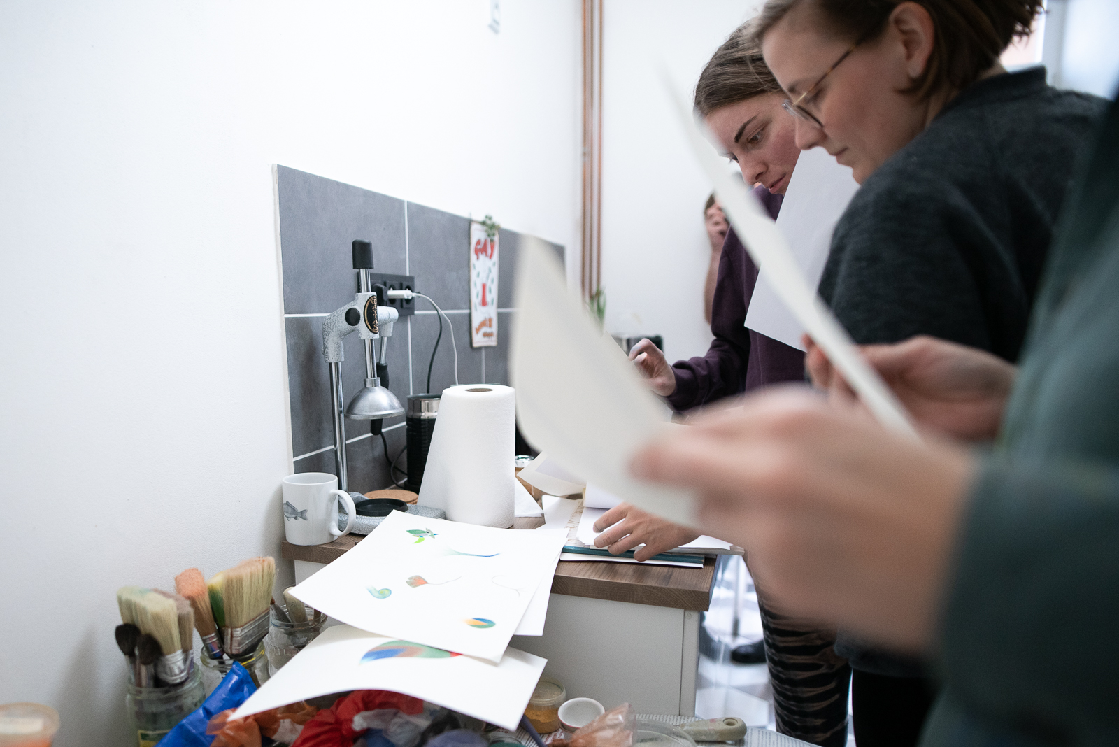 Marie: Ale v nejlepším případě skicujeme na tom místě, kde pak i pracujeme. V kontaktu s lidmi. Ideální stav je, když tam můžeme i pár dnů pobýt. Pokud ale navrhujeme tady v ateliéru, tak si každá kreslíme, pak kresby srovnáme, něco vybereme, něco vyhodíme. Potom některá něco obšlehne od jiné, udělá to trochu líp nebo trochu hůř, a potom to zase uděláme jinak.