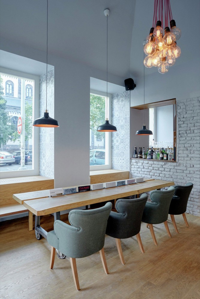 Hledáte toalety? Neváhejte vstoupit do knihovny. Otevřený prostor, ve kterém není nic navíc, poskytuje přehled o tom, co se děje v kuchyni, v sále i na ulici. Akorát pokud hledáte toaletu, budete muset vstoupit do knihovny.