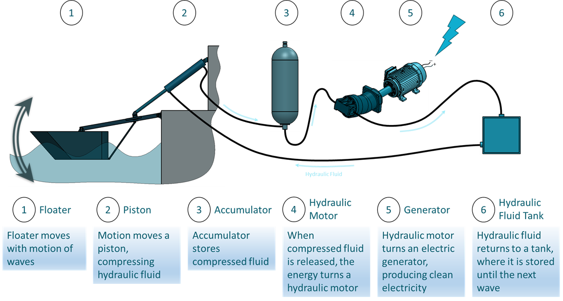 WEC stojí na staré dobré ověřené geometrii Salterovy kachny, což je plovák kapkovitého profilu s gyroskopem uvnitř. Vlny pohybují plovákem, takže roztáčí gyroskop a vytváří energii, kterou generátor mění s účinností až 90% na elektřinu. Seřazení plováků v optimálním úhlu vůči vlnobití, jejich množství a krátká délka rotorů, jež umožňuje využití pohybu oběma směry, má za výsledek nepřetržitou rotaci společné osy rychlostí odpovídající té u větrných turbín.