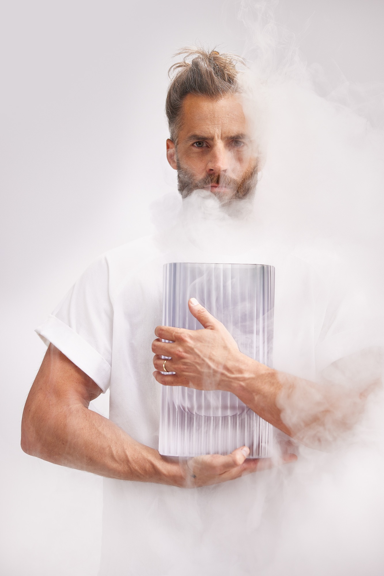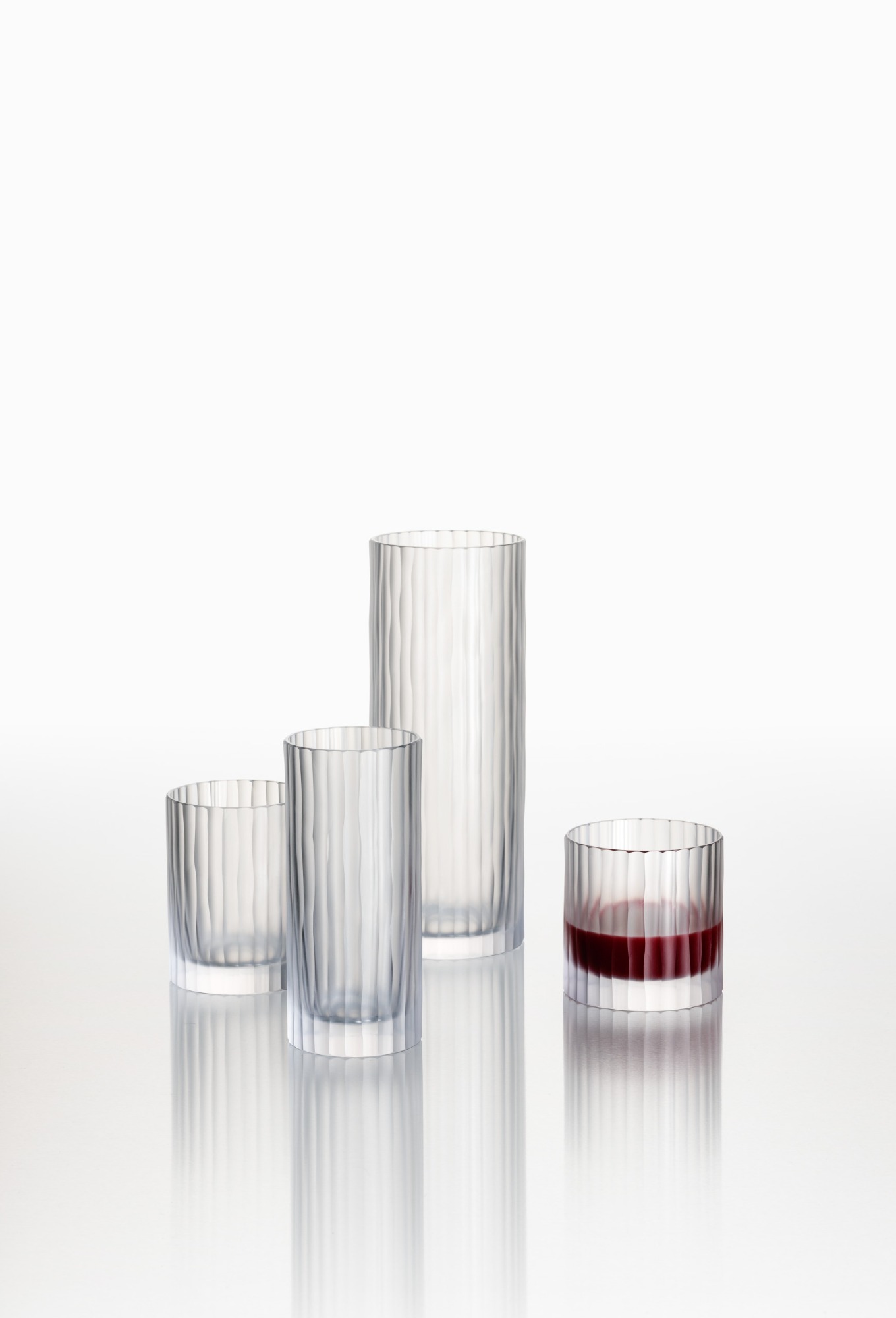 Zbrusu novou je i kolekce nápojových setů Spirit, která vede k zastavení a vychutnání si momentu – například s kvalitním pitím v ruce, k čemuž název kolekce odkazuje. Jednoduchým, ručně foukaným karafám setů Gentle, Pure a Confident kontrastuje výrazná broušená zátka, jež protíná hrdlo a vede hluboko do útrob nádoby. Každá zátka je něčím jiná, dají se koupit i zvlášť a je samozřejmě možné je mezi sebou kombinovat. Dominantní prvek zátky netvoří ústřední bod kolekce jen z designového hlediska, odkazuje k historii produkce lékárenského skla Rückl.