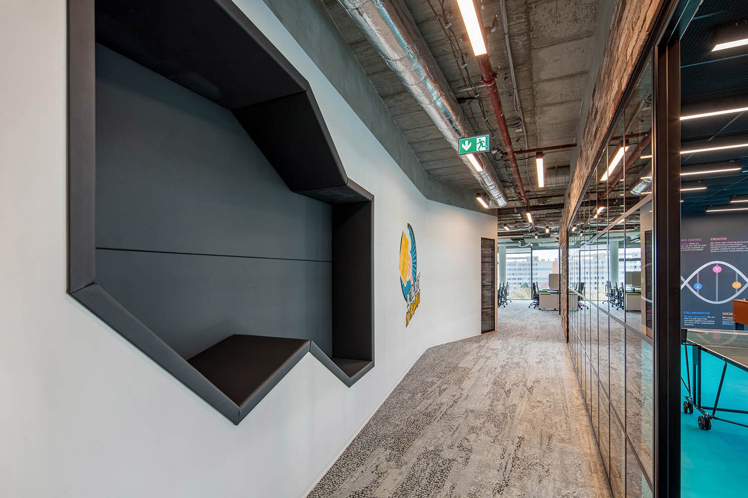 Půdorysné uspořádání místností je záměrně v rozporu s obvyklým utilitárním kancelářským chodbovým schématem, které svou fádností demotivuje a také stěžuje přirozenou orientaci v prostoru. Naší koncepcí je sdružení vždy několika místností do větších celků – „boxů“, které jsou pak celé obloženy v jednom z materiálů - dřevo, cihla, kov, beton.