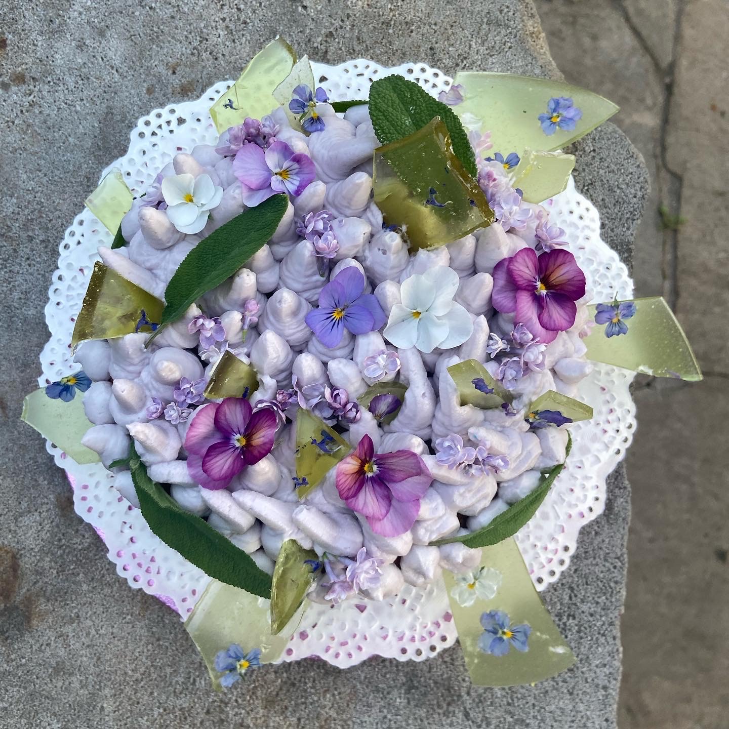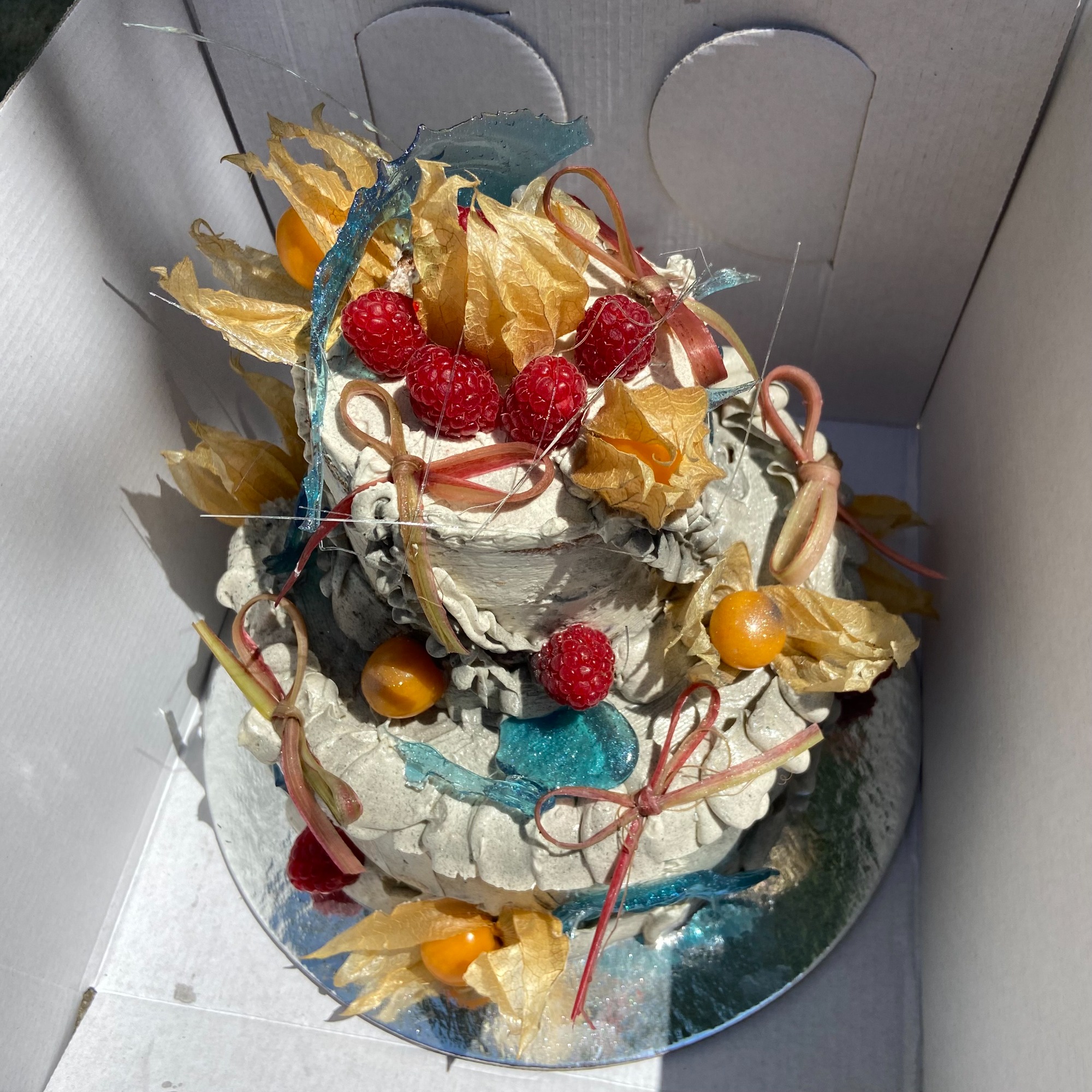 Na většině mých dortů najdete typicky takzvané jedlé sklo, což je rozpuštěný cukr s glukózovým sirupem. Pracuji s ním co nejjednodušeji, zkrátka podle sebe, při jeho výrobě maluju po pečícím papíru. Za mě je to velmi efektní ozdoba, dortu dodává určité drama.