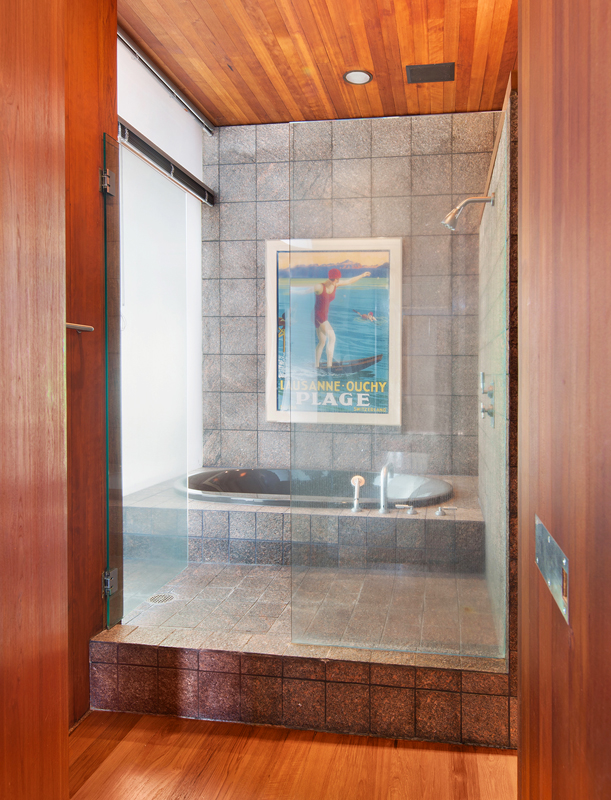 K domu se dá přijet seshora na uzavřené parkoviště, pěšky se k němu dostanete i z úrovně ulice, odkud se linou schody napříč zalesněnou vodní zahradou. Obě cesty vedou do atria. Dominantními prvky v interiéru jsou bezpochyby plovoucí kamna v obývacím prostoru, který je díky otevřenému charakteru napojen na jídelnu a kuchyň s centrálním ostrůvkem. Mezi dalšími určitě nesmíme opomenout ani místnost s vestavěnými policemi a mediální stěnou či ložnici s krbem a francouzským oknem vedoucím na soukromou terasu. Původně rezidence zahrnovala i hudební studio, později bylo přetvořeno na místnost pro hosty.