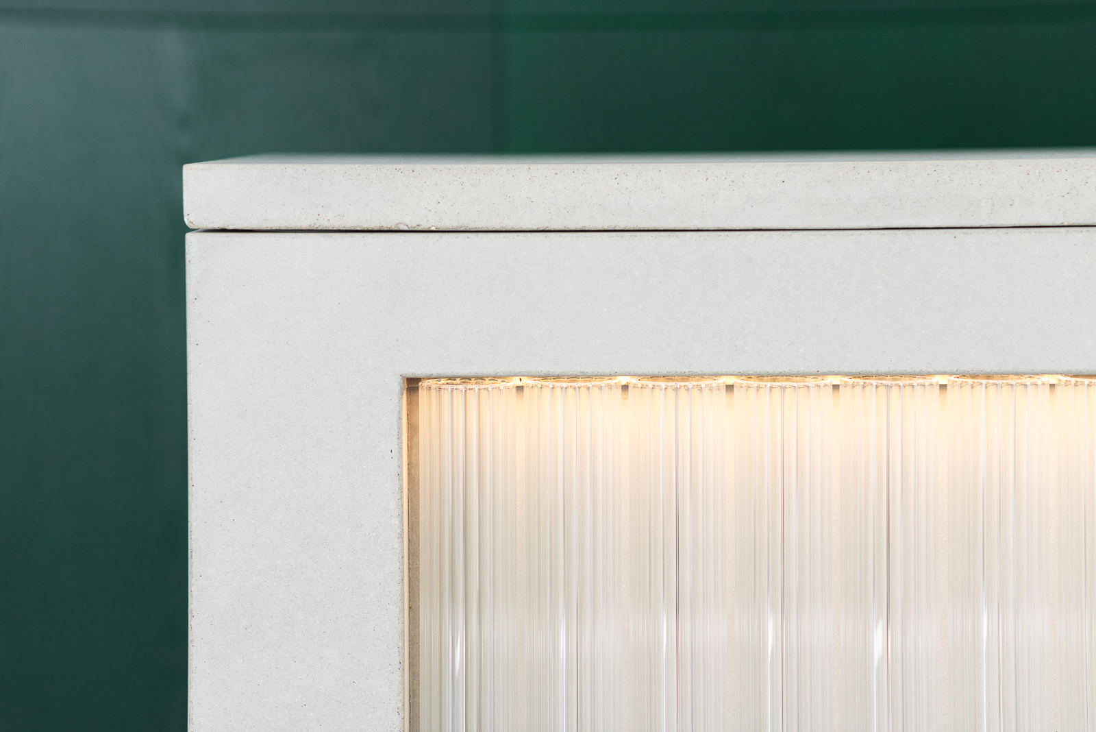 Dominantu prostoru představuje půltunový betonový pult podle vlastního návrhu: „Chtěl jsem, aby se tu objevilo i mé vlastní autorské dílo. Beton mám v architektuře velmi rád a podle mě jde dohromady skvěle právě se sklem,” vysvětluje Martin Jakobsen. Z přední strany nechal pult osázet skleněnými trubicemi, které jsou zároveň ukázkou materiálu pro výrobu sklenic Jakobsen Design. „Takto vypadá polotovar předtím než se zpracuje, přičemž se nakupuje se v různých délkách a průměrech. Jedná se o české simaxové sklo,” dodává. Osvětlení trubic navíc lze ovládat na dálku přes mobil.
