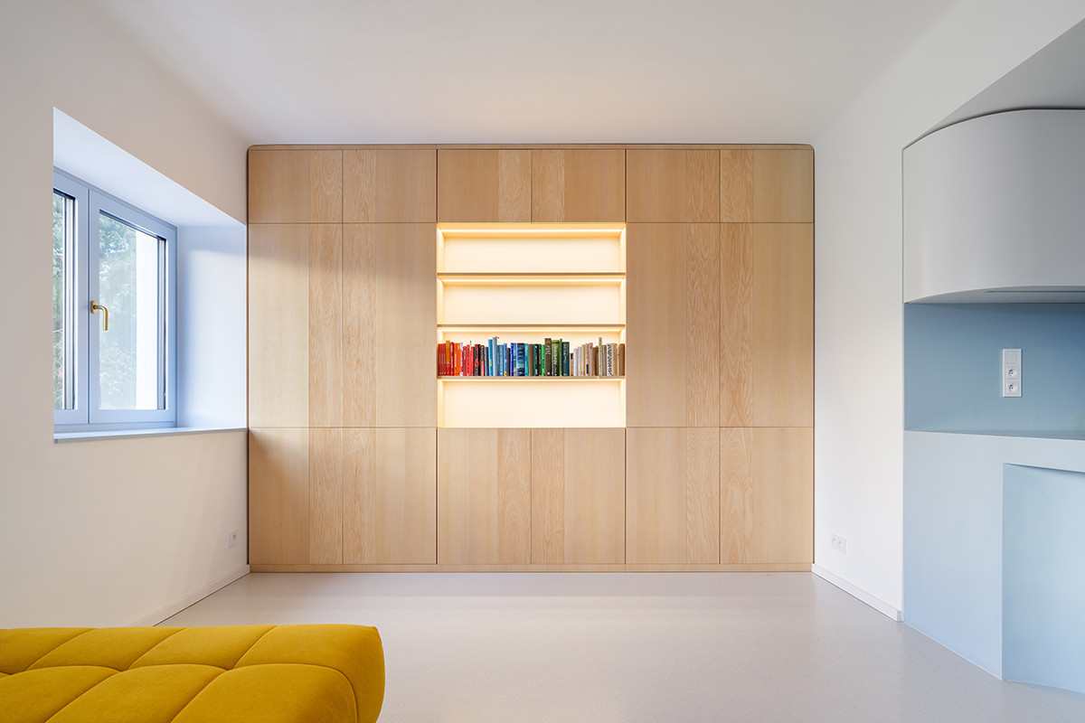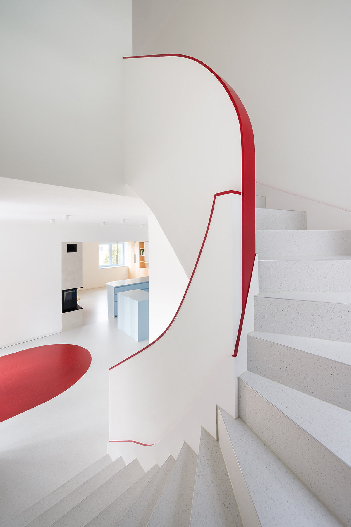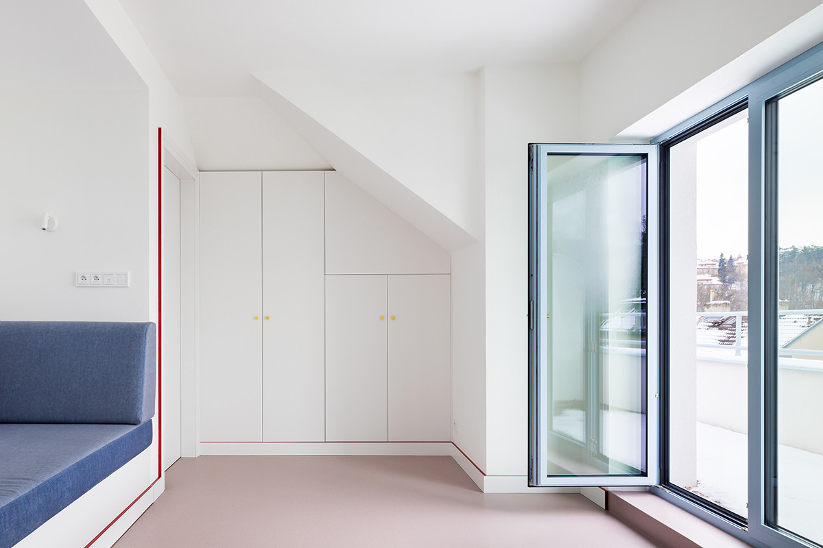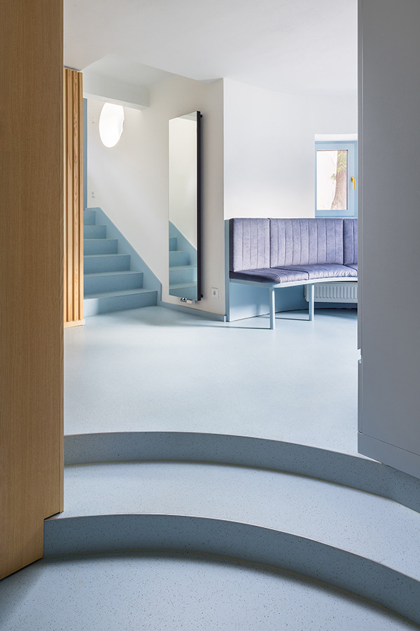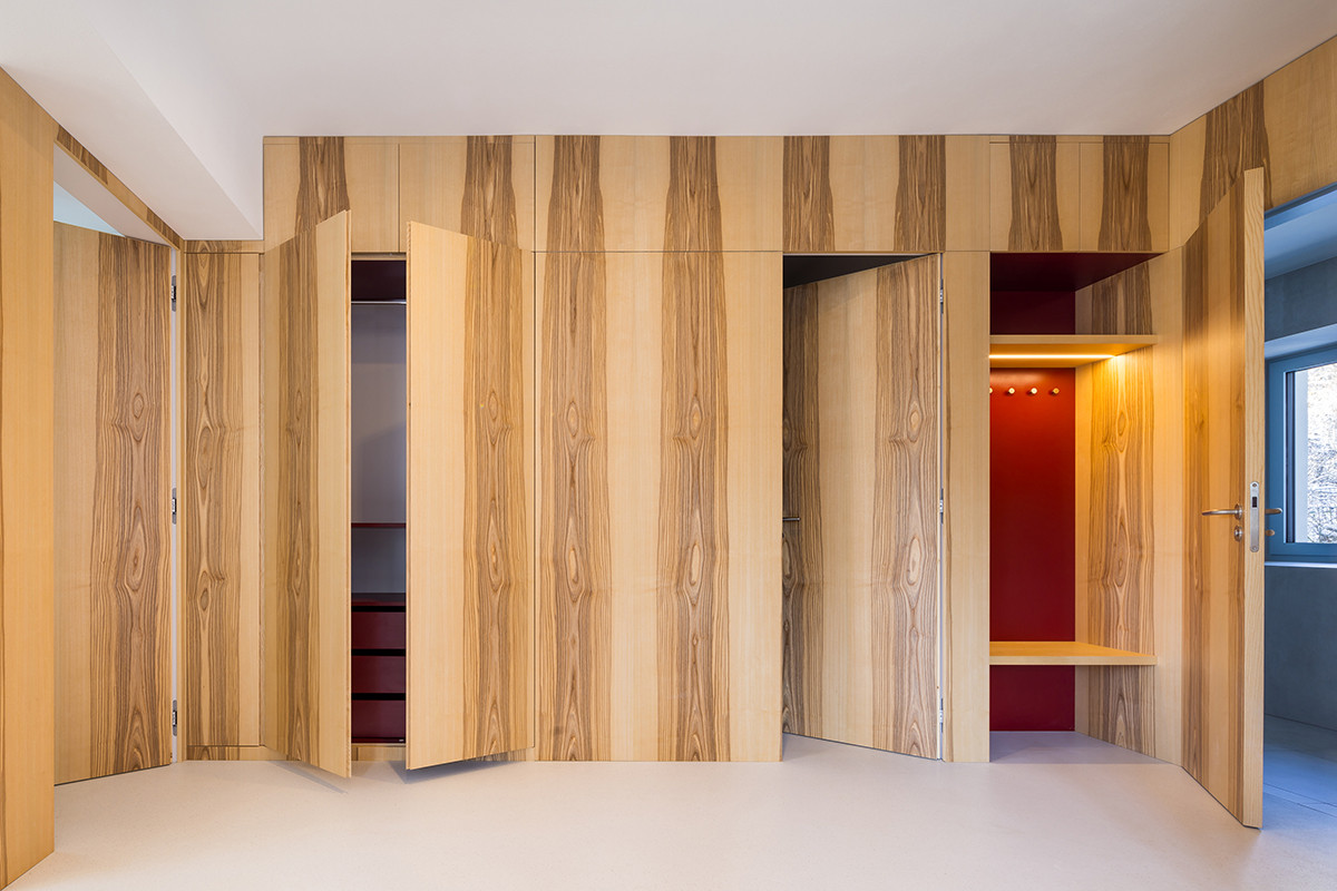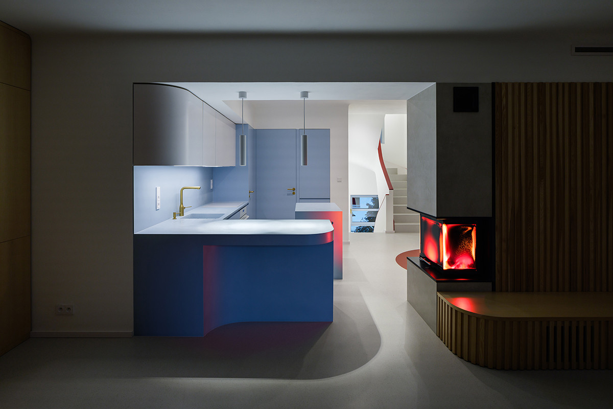 Umírněný vzhled, jak se na fasádu tohoto typu sluší, směřuje všechna další překvapení do útrob domu. Obnovené kvality minimalistických kontur stavby doplňují, někdy i lemují, odstíny červené a modré v plochách vestavěného nábytku. Střídají se s těmi dřevěnými, které interiér vizuálně oteplují.