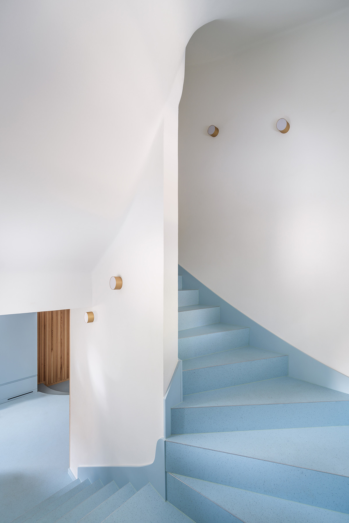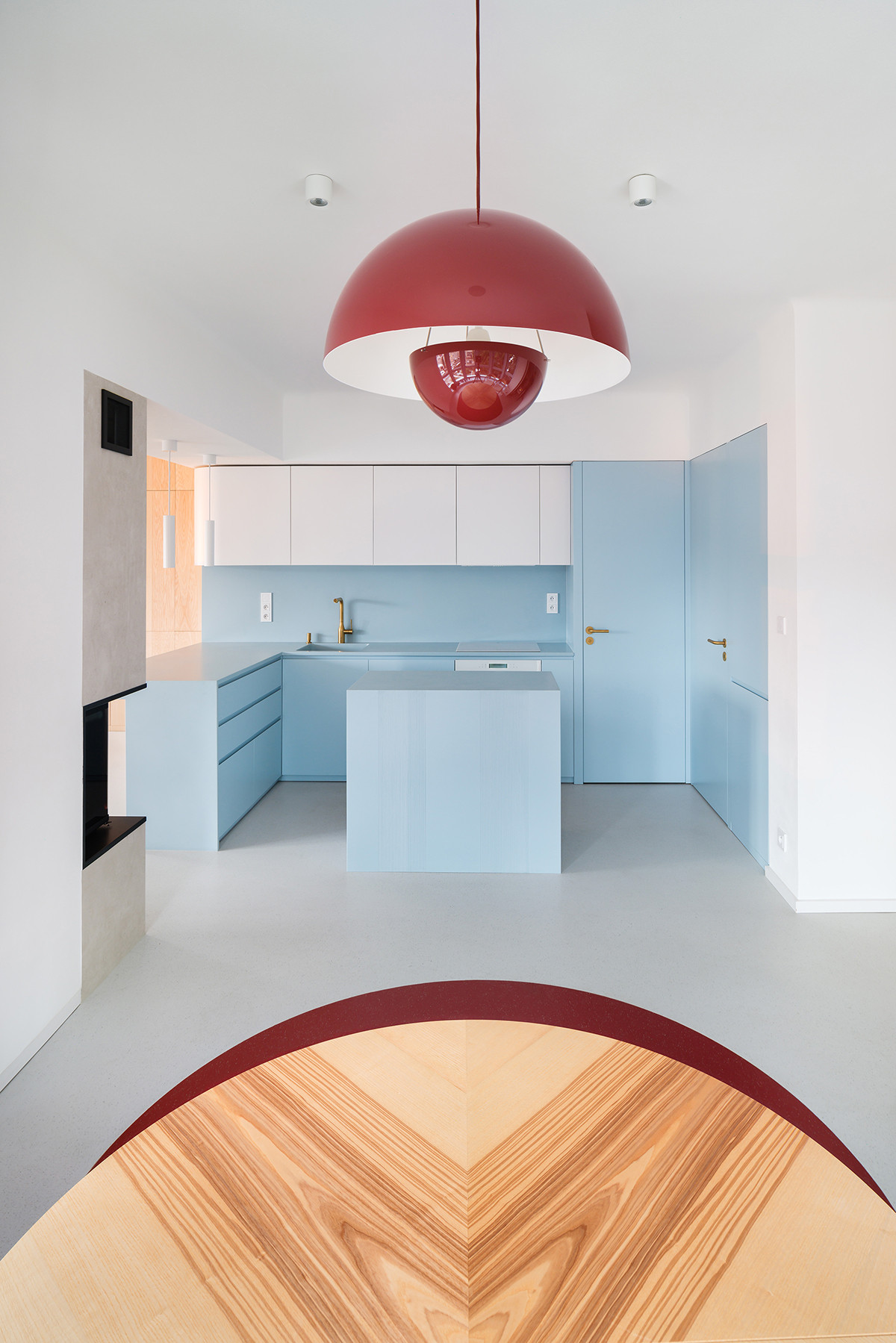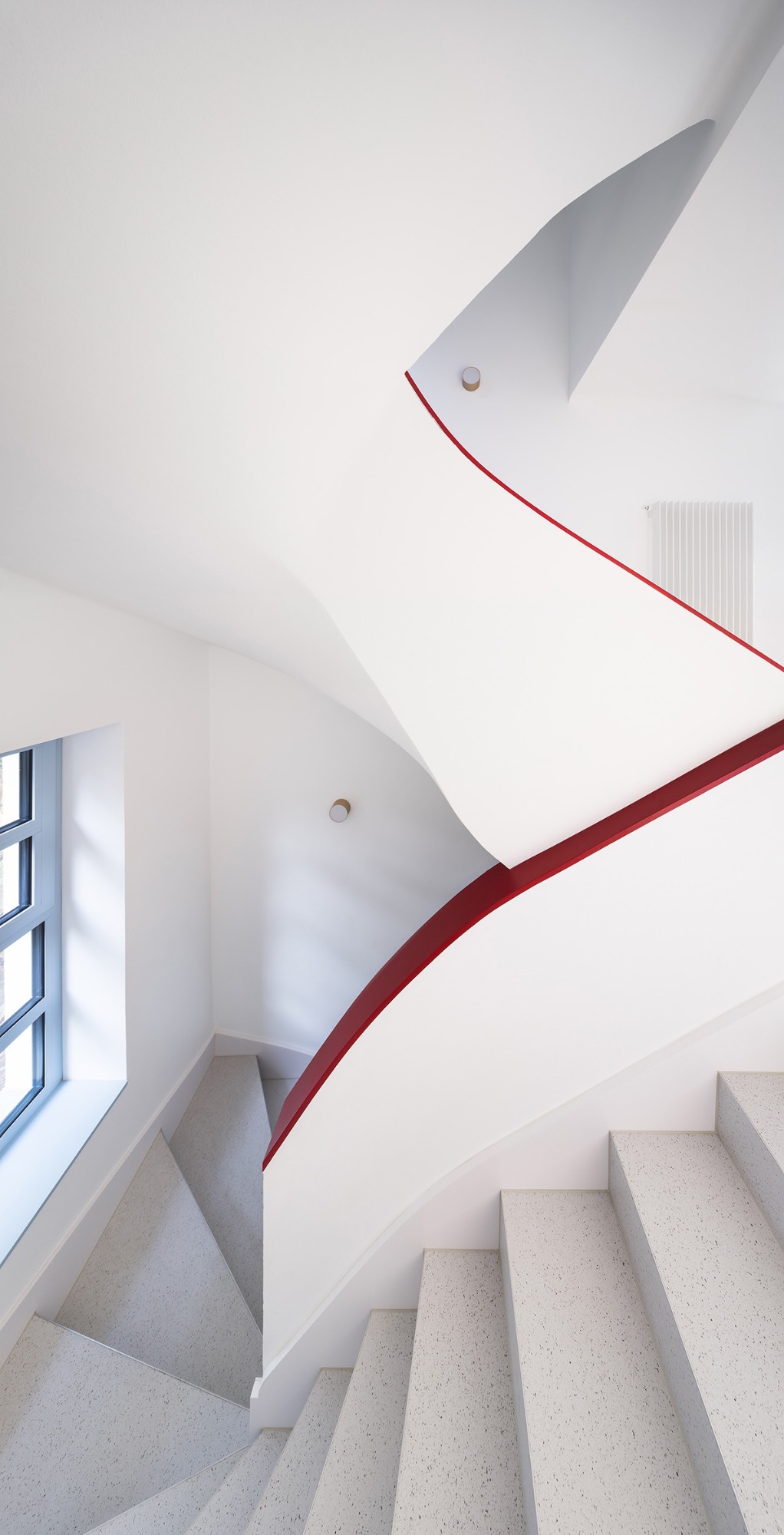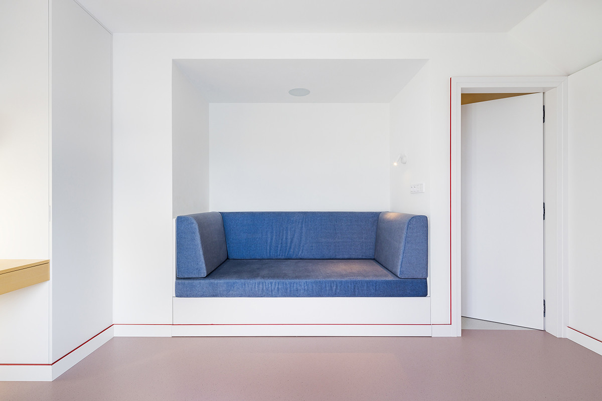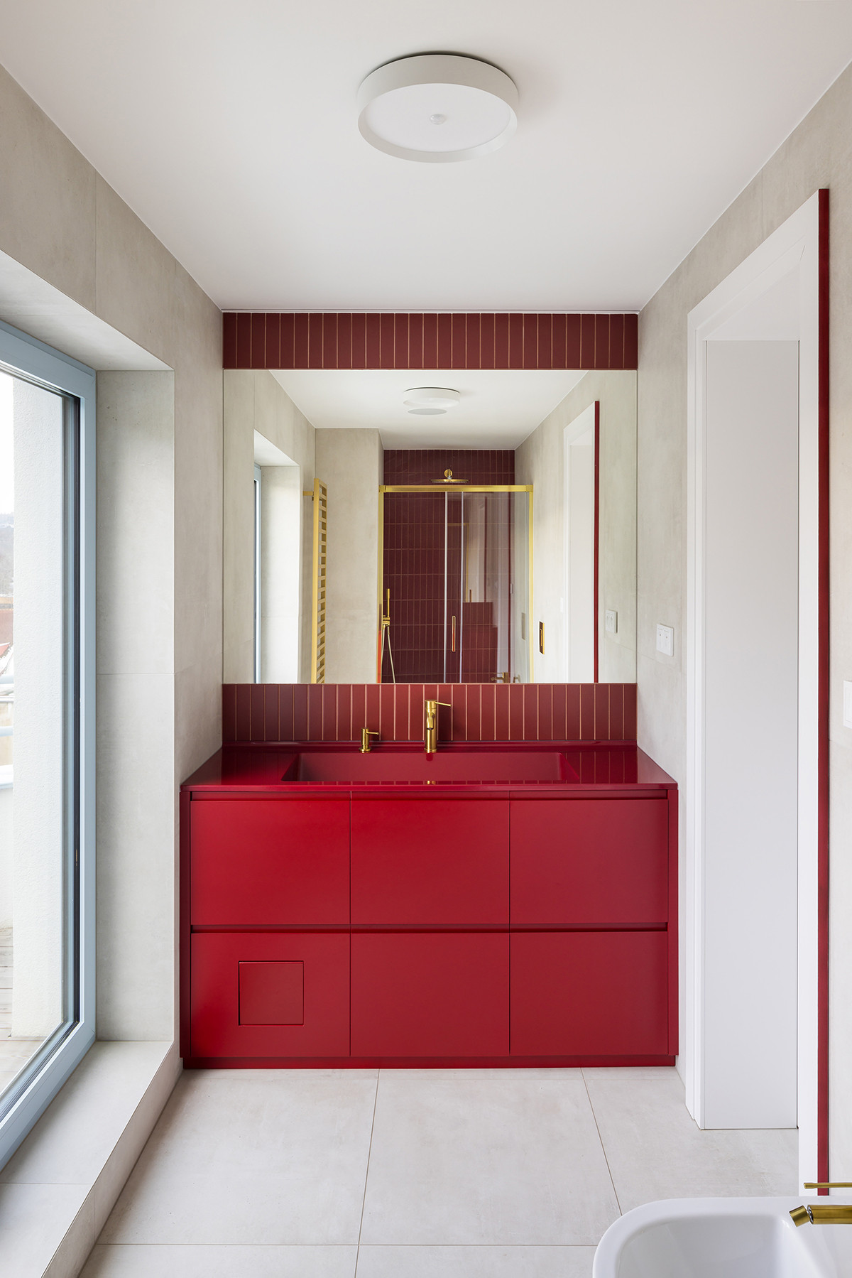 Umírněný vzhled, jak se na fasádu tohoto typu sluší, směřuje všechna další překvapení do útrob domu. Obnovené kvality minimalistických kontur stavby doplňují, někdy i lemují, odstíny červené a modré v plochách vestavěného nábytku. Střídají se s těmi dřevěnými, které interiér vizuálně oteplují.