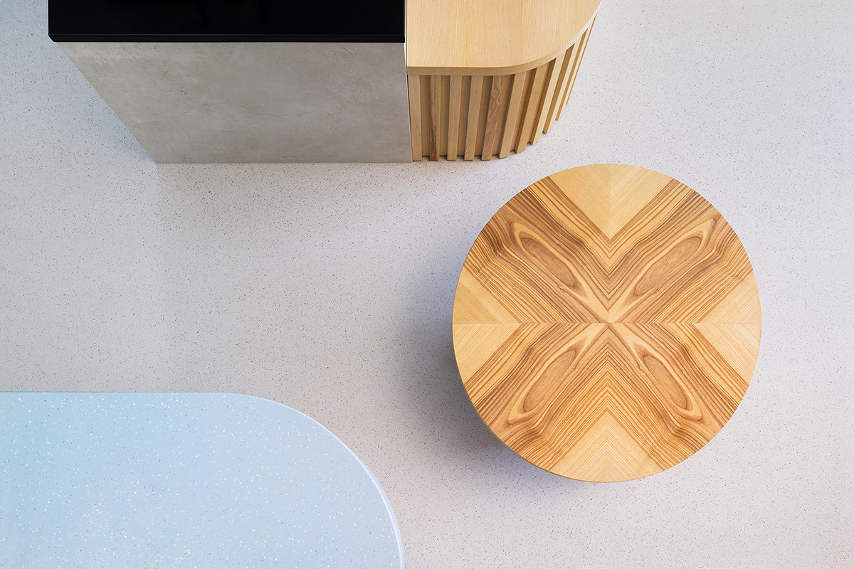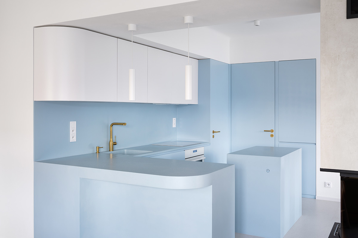 Čisté linie stavby zrcadlí i pojetí nábytku, sloužící jako vizuální tečka za konceptem rozlévajícím se celým domem. Barvitý vnitřní svět s tím vnějším propojují hliníková okna, která nesou odstín modré – speciálně namíchané pro tento dům. A podle modrých oken architekti pojmenovali i tento dům označením modrookný.