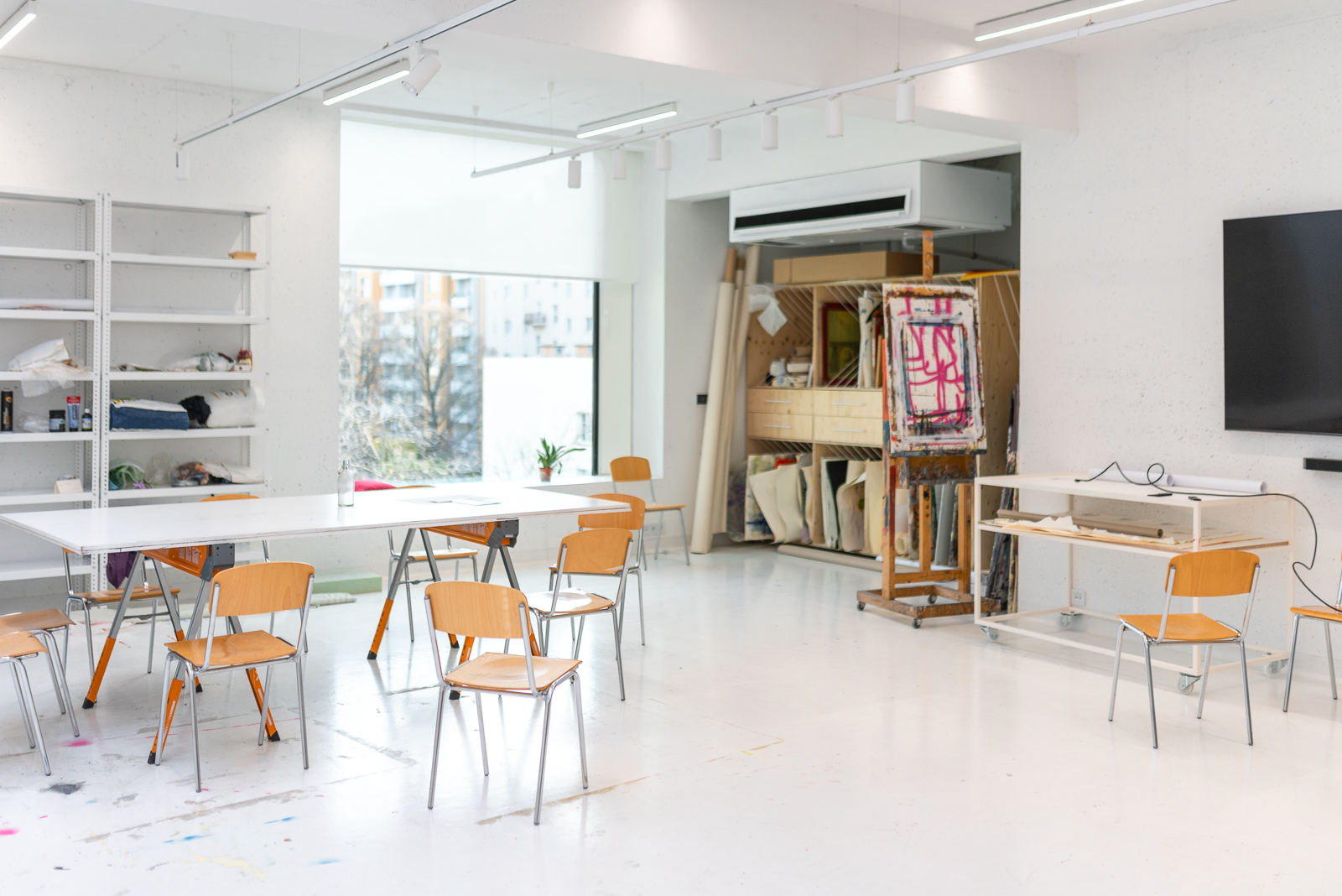 Interiér utvářený bíle natřenými betonovými stěnami je navržen s důrazem na flexibilitu a funkcionalitu. Nábytek vychází z jednoduchých prvků, jako jsou desky a kozy ze stavebnin, a je koncipován tak, aby byl snadno manipulovatelný a umožňoval rychlé přizpůsobení prostoru pro různé potřeby.