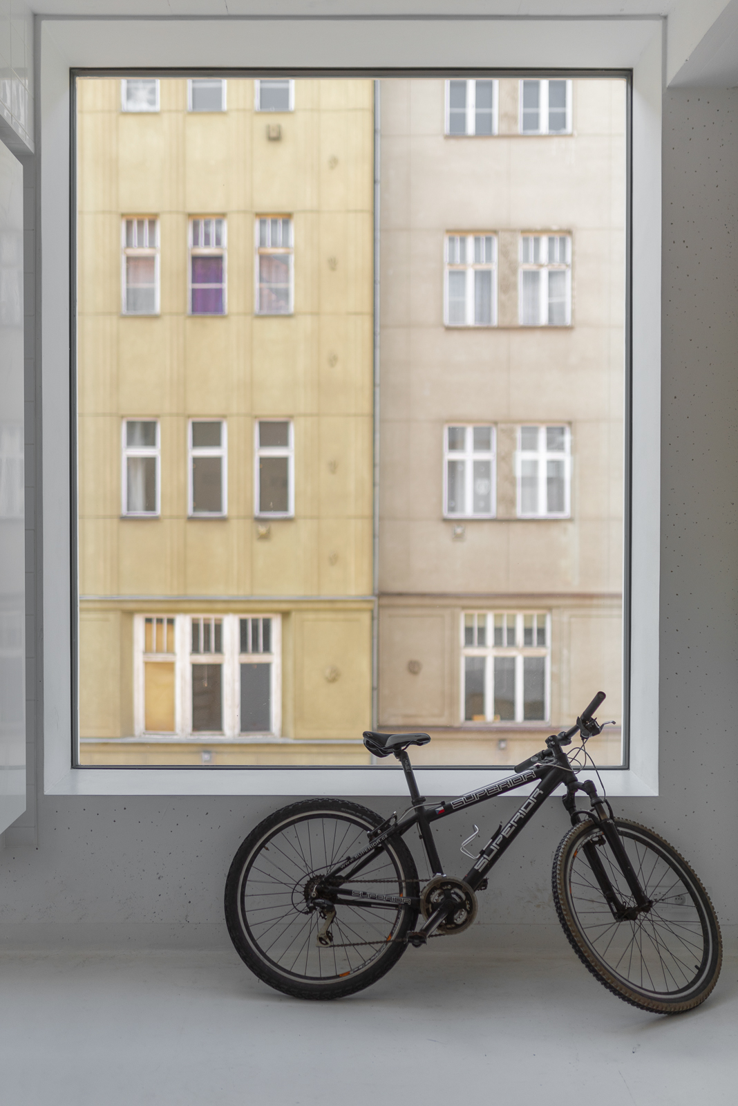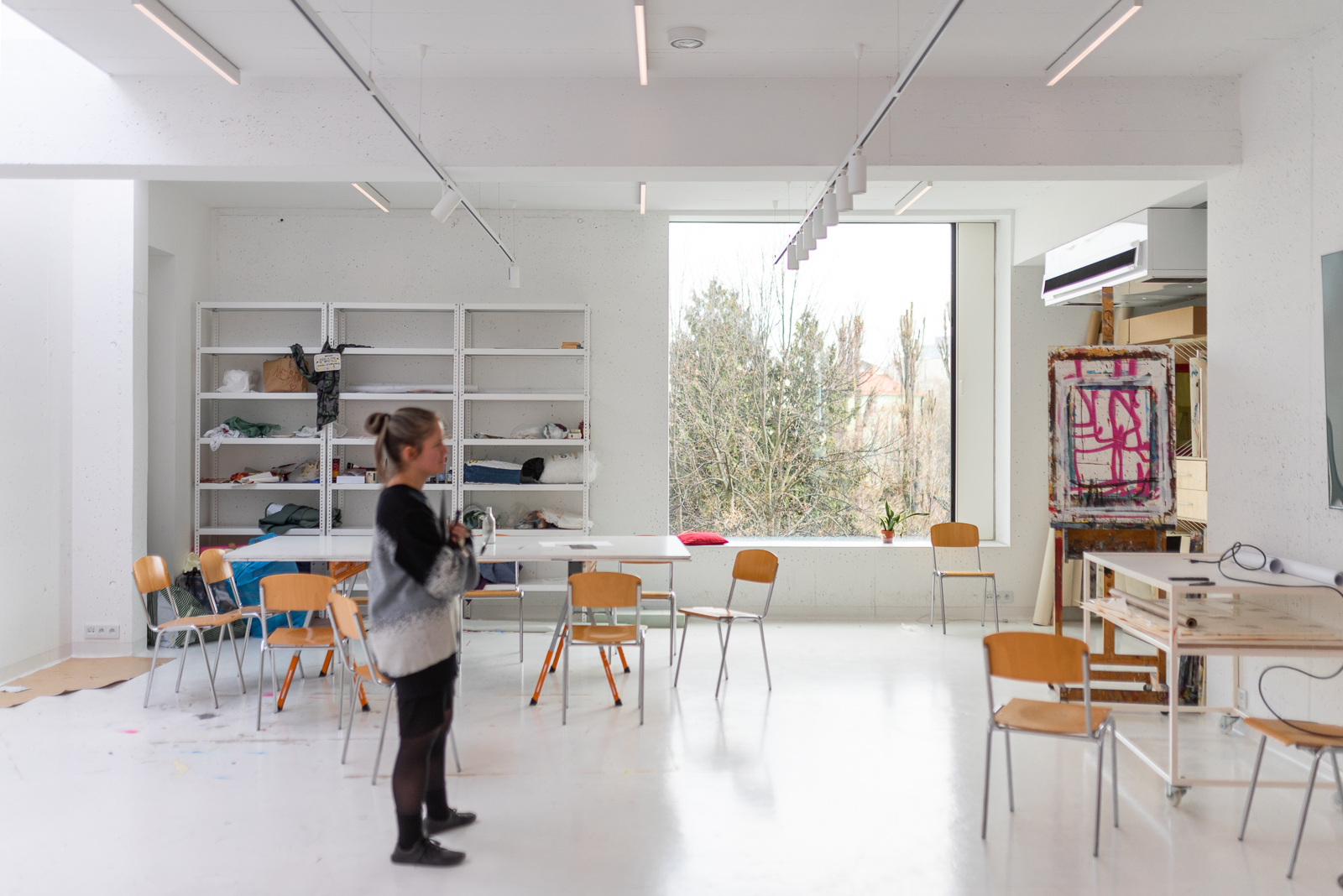 Okna v dílně i v ateliéru o patro výš jsou orientovaná na jedné straně do ulice a na straně druhé do parku. Rozvržení a rozmístění oken umožňuje efektivní využití denního světla a zároveň poskytuje působivé průhledy.