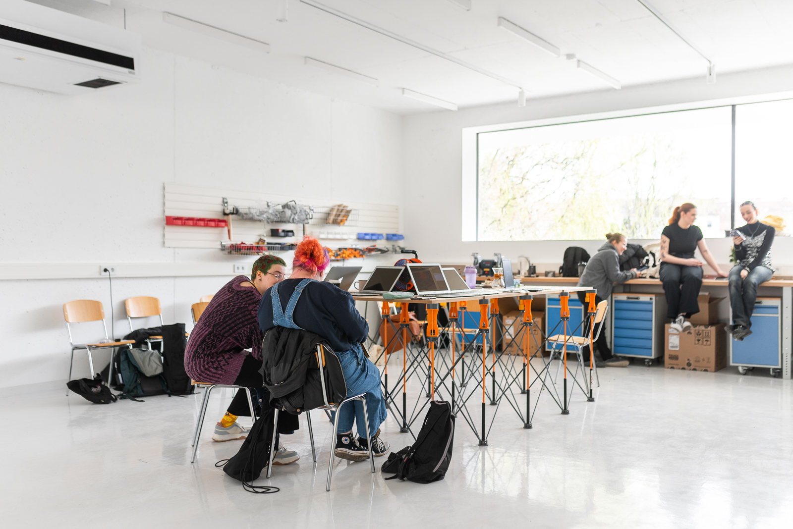 Po budově nás provedl autor architekt Michal Palaščak společně s Janou Nedomovou, odbornou asistentkou z Pedagogické fakulty Masarykovy univerzity. V prvním patře, do kterého je situována dílna, zrovna studenti pracovali na 3D tiskárně. Podle jejich slov se jim v nových prostorách pracuje skvěle.