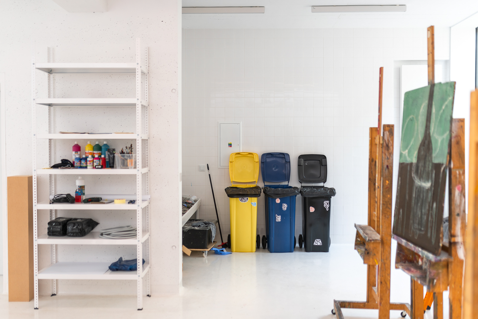 O patro výš nás v malířském ateliéru ovane typická vůně barev, prostor zčásti zaplňují malířské stojany, na umyvadle se suší štětce. Kromě dvou velkých oken sem proudí denní světlo i ze světlíku. Ateliér je zabydlený, místy tu už vznikly šmouhy od barev, v koutě stojí tři velké plastové popelnice na tříděný odpad. „Prostory dílny a ateliéru jsme navrhli tak, aby snesly všechno. Krása spočívá v tom, že se to tu nemůže ušpinit, protože už to k ušpinění určené je, vidíte, podlaha je zamalovaná od barev a ničemu to nevadí. Je to přece pracovní malířský ateliér, neruší mě tu ani ty obyčejné popelnice. Jsou praktické, dají se jednoduše převézt,” vysvětluje Michal Palaščak.