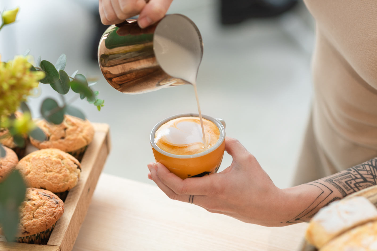 Základ a středobod kavárny utváří v Lístku bar: „V tom mám jasno, bar musí uchvátit,” vysvětluje majitelka. Ten v Lístku na první pohled zaujme zelenými kachličkami, dřevěnou deskou z masivu a samozřejmě kávovarem. Stříbrné La Marzocco návštěvníci Lístku znají už z náměstí. Rozvržení interiéru konzultovala Veronika s interiérovou designérkou, aby měla přesnější představu. Společně se také shodly na výmalbě zdí ve tvaru oblouků. „Chtěla jsem zdi kavárny nějakým způsobem ozvláštnit, ale třeba cihla nebo stěrka se mi do konceptu nehodily. Kamarádka designérka mi navrhla namalovat na zdi tyto oblouky a přiznám se, že jsem nadšená,” říká.