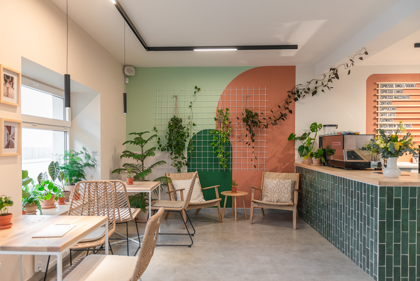 Prostor na zdi za barem vyplňuje tabule s nabídkou kávy. „Tabuli mi stejně jako stoly vyráběl bratr, pracuje se dřevem. Moje původní představa byla, že bude složená pouze z lišt, ale přesvědčil mě, že takto to bude vypadat lépe. A měl pravdu,” směje se Veronika Grobelná. Písmenka jí na míru vytiskl soused na 3D tiskárně.