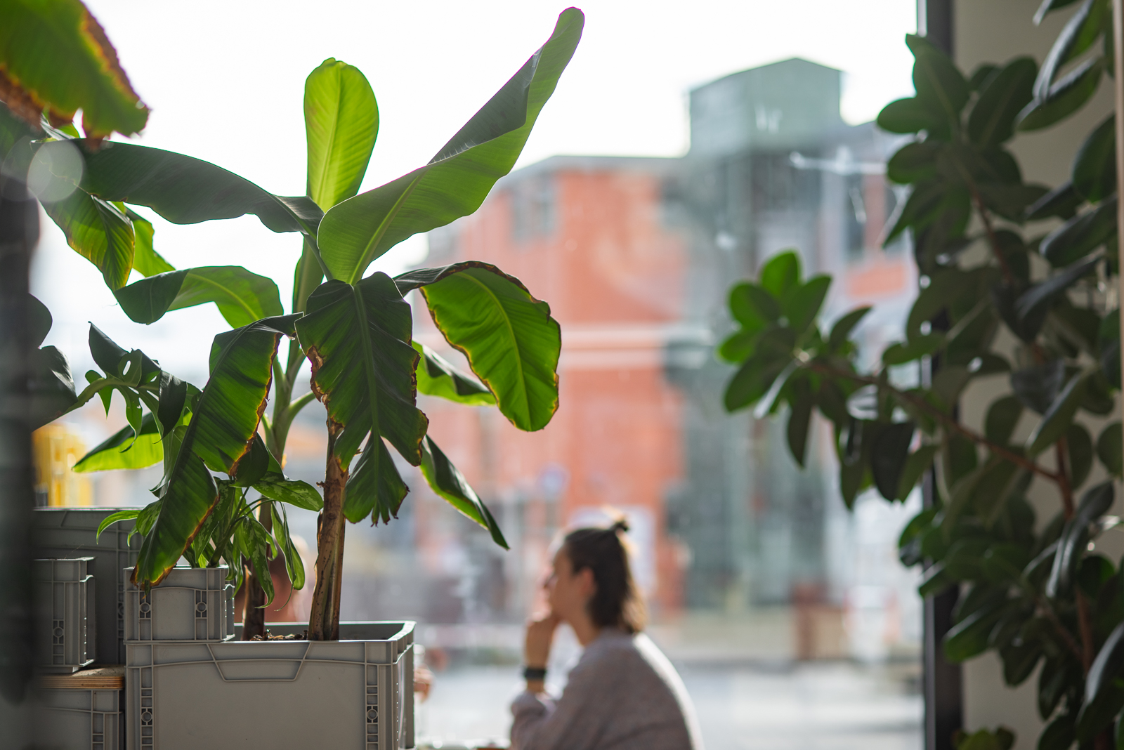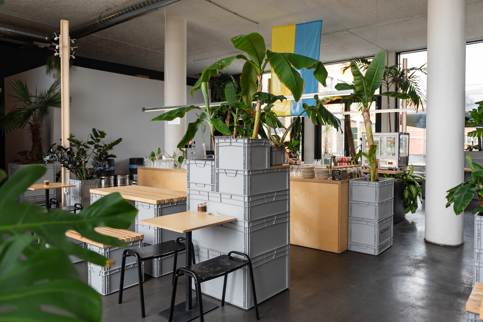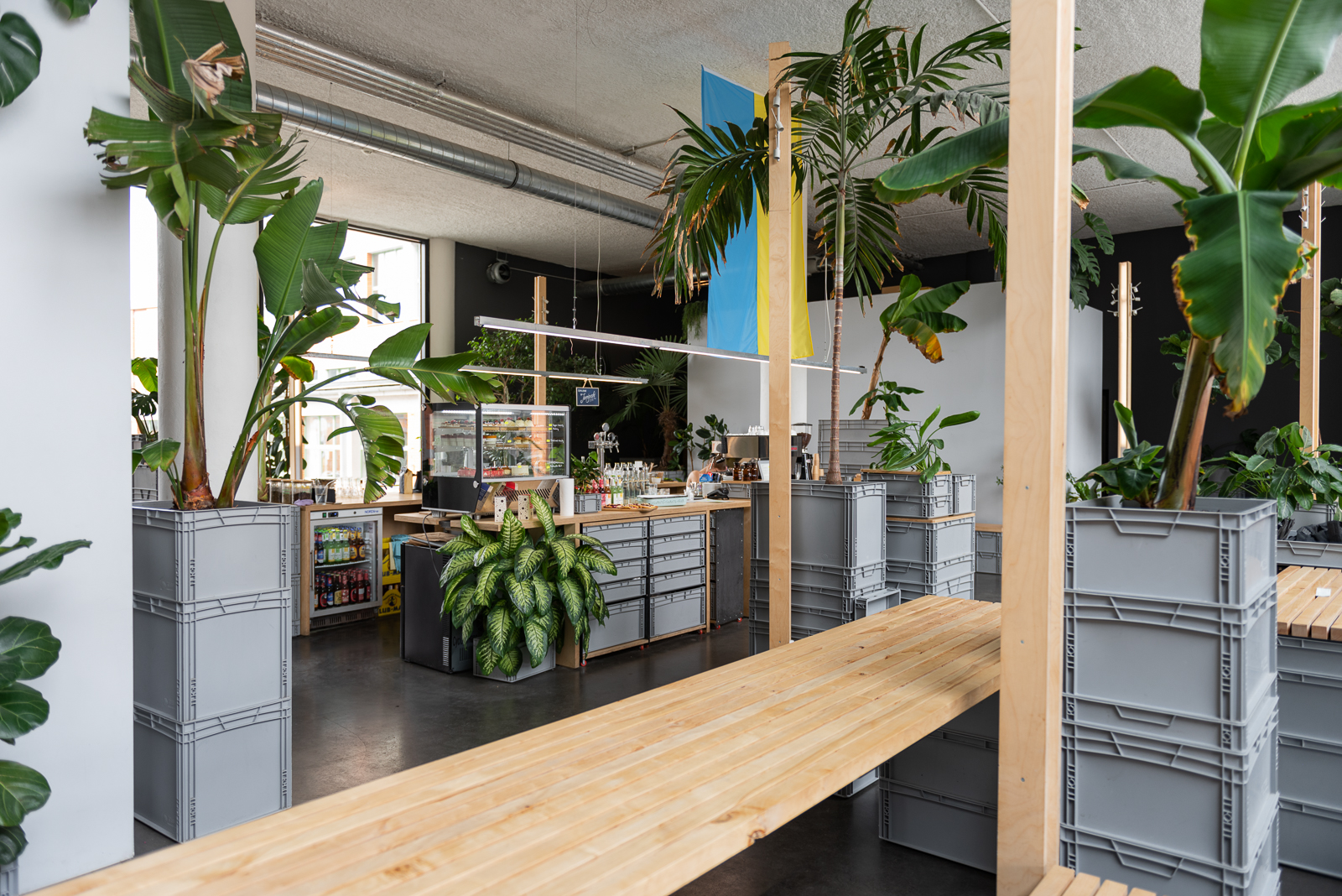 Variabilitu prostoru umožňuje použití šedých přepravek, které se staly základem veškerého vybavení podniku: „Přepravky jsme zvažovali nejprve pouze jako obaly pro rostliny, nakonec jsme z nich vytvořili veškerý sedací nábytek i úložné prostory v kuchyni a baru. Prostorový efekt převýšených květináčů se nám osvědčil právě pro modelaci různých atmosfér podle našich potřeb. Je to praktické a dostupné řešení,” říká architekt Tichý.