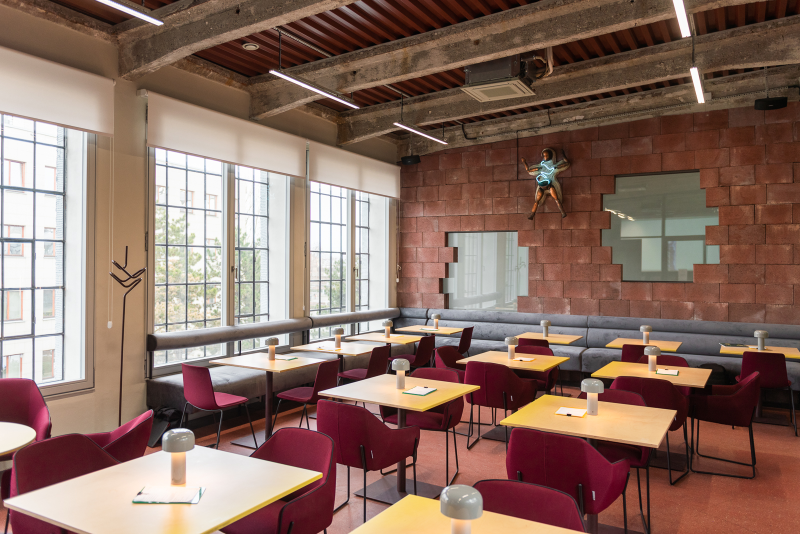 Interiér barevně oživuje žlutá, která se objevuje na dřevěných stolcích v podobě valéru. Architektka popisuje, jakým způsobem o podobě stolů s kolegy ze Studia Ječmen uvažovali: „Naším záměrem nebylo sladit vše naprosto dokonale. Měli jsme ideu dřevěných stolů, kde je přiznaný materiál. Dřevo zůstává být vidět, zjemnili jsme ho žlutým valérem. Žlutá je zcela mimo barevnou škálu stavby.” Kovové podnože židlí odkazují ke kovu jako typickému průmyslovému materiálu.