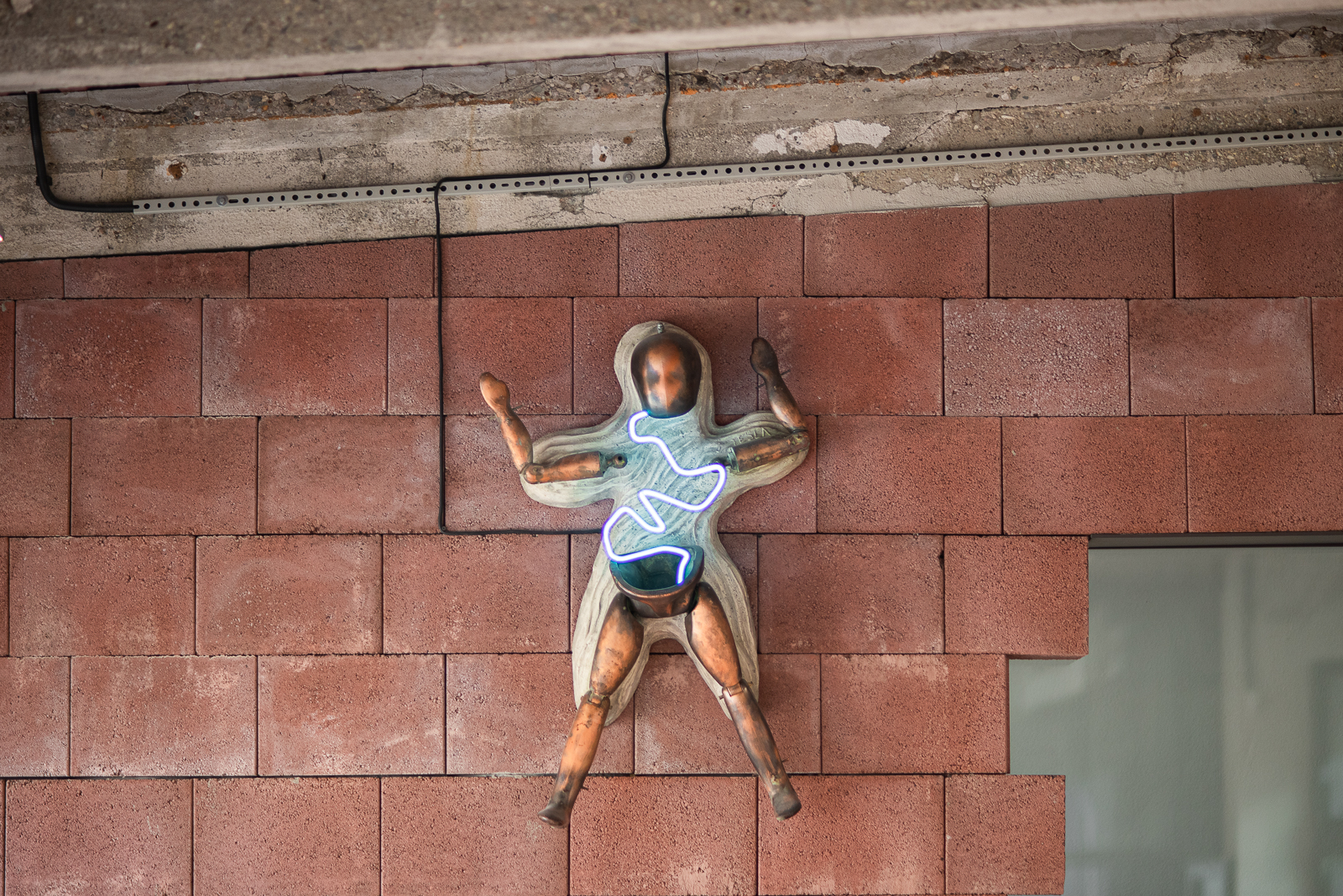 Zevnitř kavárny na červené stěně visí výrazná socha Michala Cimaly s názvem Mladý Nikola Tesla po experimentu. „Socha ztvárňuje představu o tom, kterak slavný vynálezce Nikola Tesla prožíval a viděl ve vizích své budoucí vynálezy. V jednom dopise své sestře se zmiňuje o tom že už v dětství viděl za určitých exaltovaných situacích, například za bouřky, některé své budoucí vynálezy hotové. Jen nevěděl, jak je zkonstruovat”, vysvětluje Cimala. Jako doplněk sochy použil svítící neon: „Tak vzniklo jakési robotické dítě, které má namísto těla elektrický výboj v abstraktní křivce”, dodává.