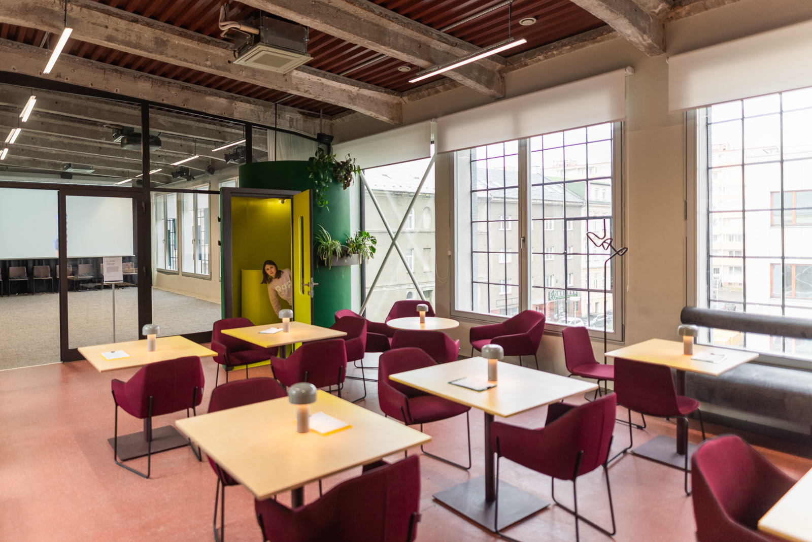 Naproti baru se nachází prostor se stolky. Zde bylo zapotřebí rozvrhnout prostor tak, aby poskytoval co nejvyšší kapacitu míst k sezení. V prostoru jsou rozmístěny čtvercové stoly s židlemi a dvě ze zdí lemuje šedá čalouněná lavice.