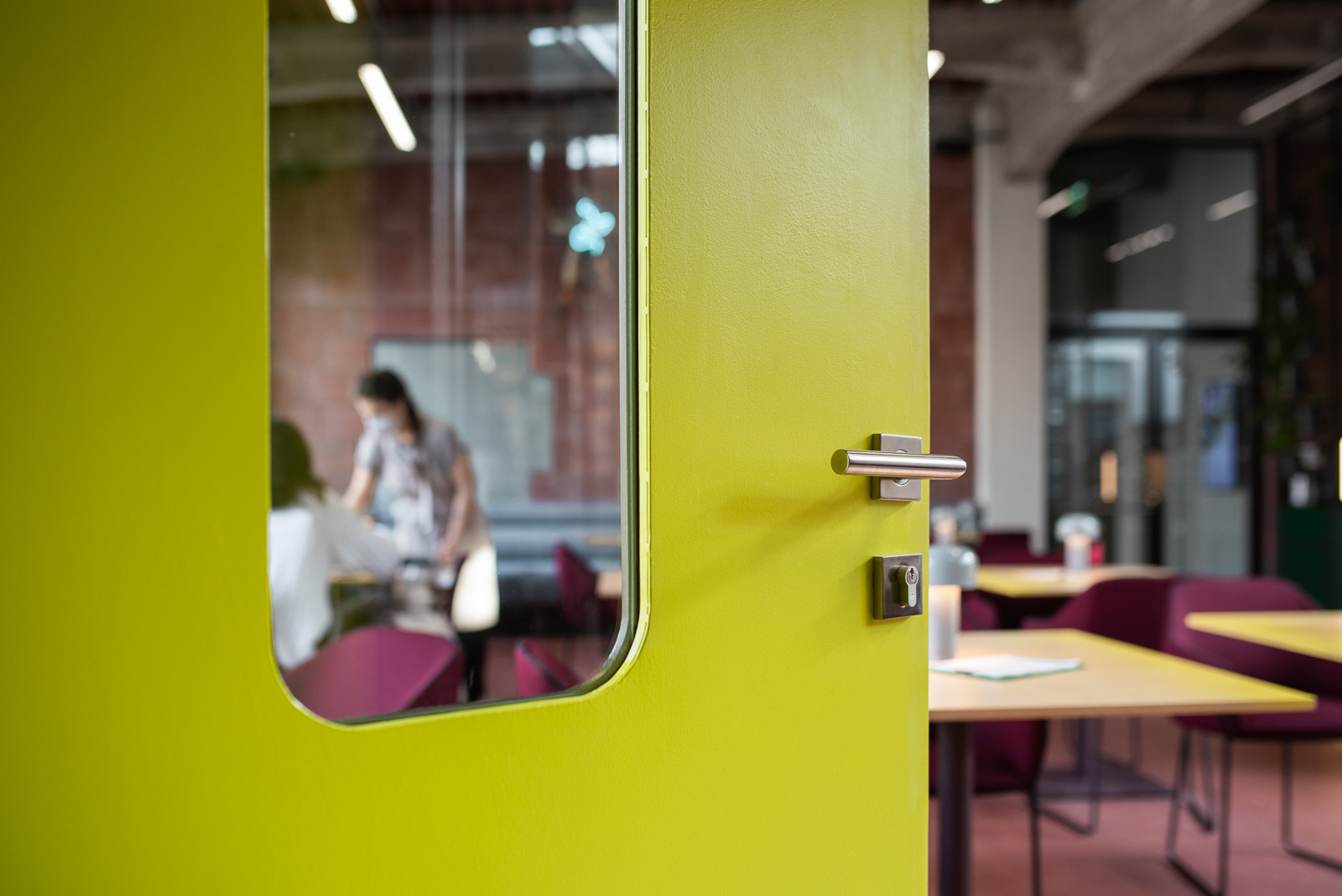 Architekti sáhli i po neobvyklém materiálu materiál - zelené folii, která se v zemědělství využívá na dopravníkové pásy. V kavárně jí pokryli bar a vstup do vnitřního točitého schodiště. Nadchla je neobvyklá vroubkovaná struktura materiálu, zároveň i zelená barva, se kterou pracují v celé budově.