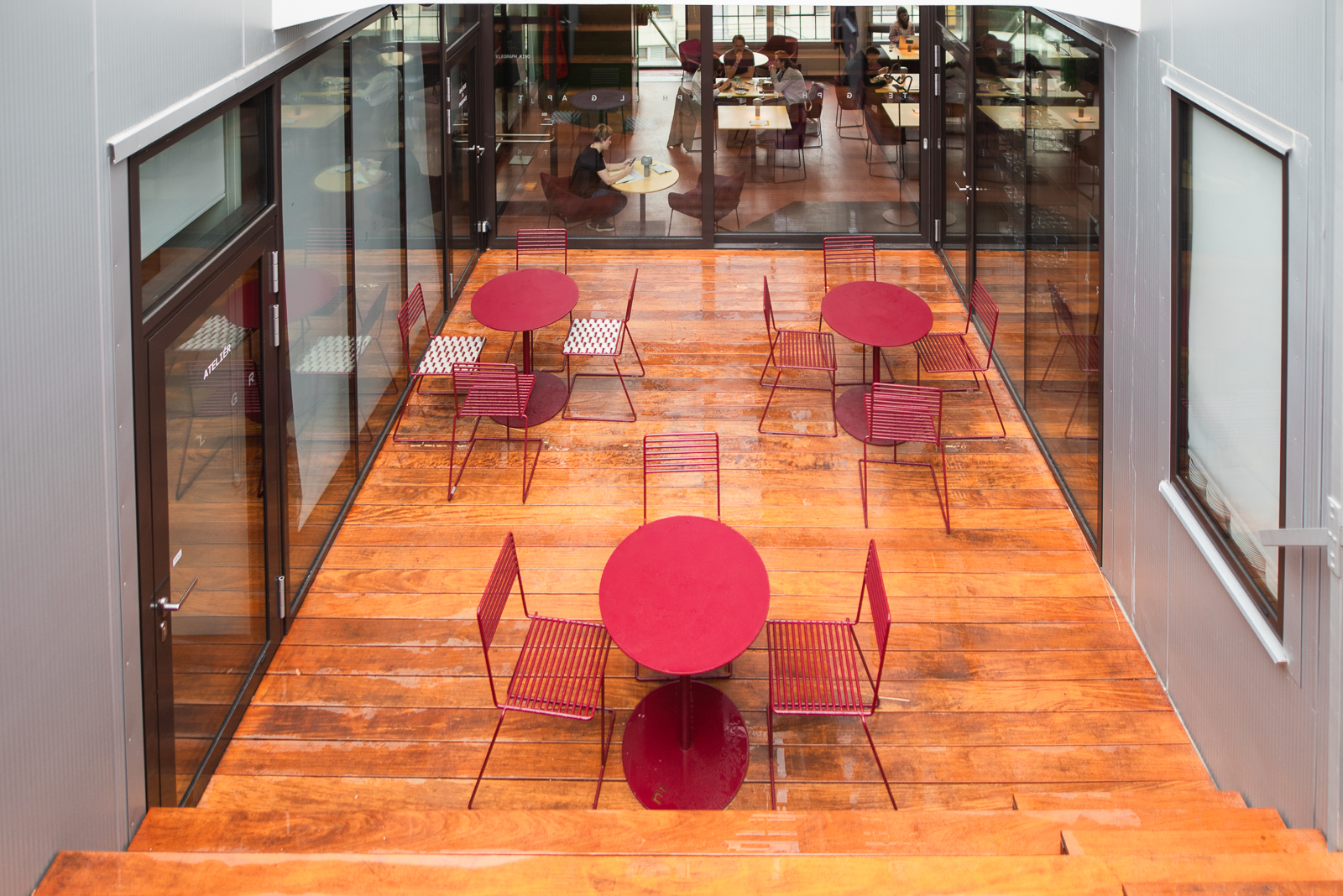 Vedle baru lze prosklenými dveřmi vyjít na terasu. V teplejších měsících se dají otevřít i velké posuvné dveře a propojit tak kavárnu s atriem. Atrium disponuje tribunou na sezení, která se v létě využívá ke kulturním akcím, talk shows nebo promítáním. Tribuna je vlastně schodiště, které vede směrem nahoru k loftu a dá se propojit s terasou, která k němu náleží. Charakter celé budovy a potažmo i kavárny je založený spíše na principu propojení než na hlubokých průhledech stavbou.