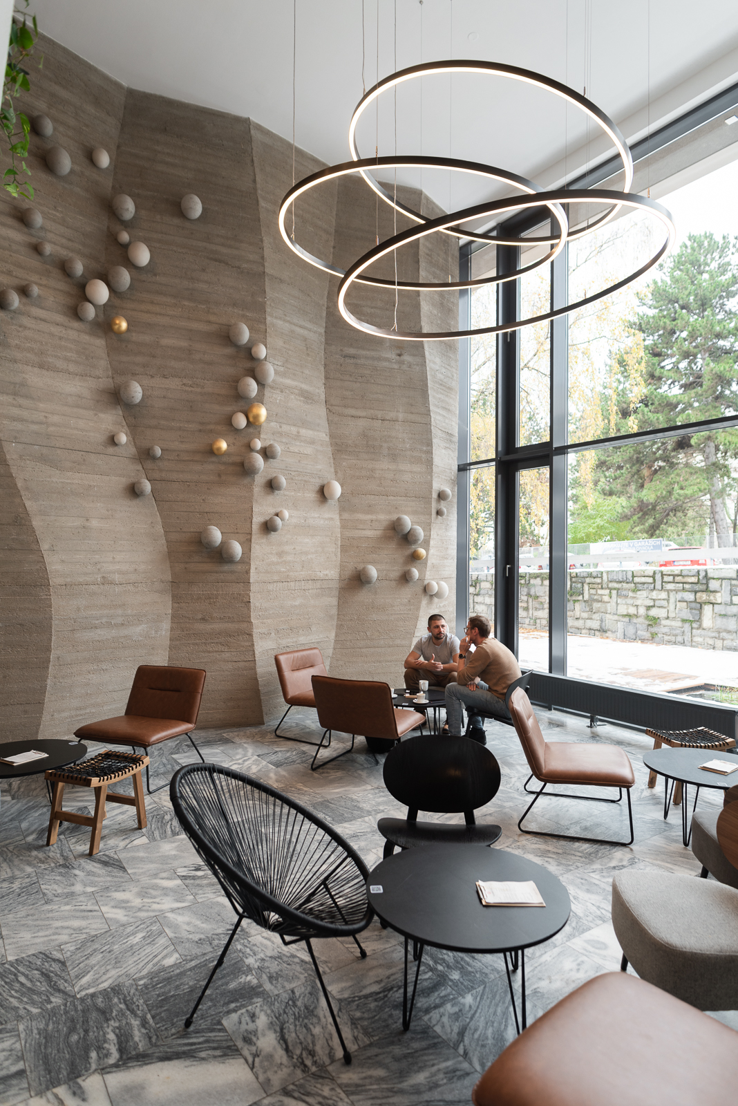 Co se týká svítidel, zvolili oproti předchozí podobě odlišný přístup. Někdejší koule nahradily velké kruhy: „Zvolili jsme svítidlo, které nesoupeří se stěnou a útvary na ní. Jinde v kavárně používáme motiv ocelové skruže, tady je to přímo svítíci skruž. Objemná a přitom jemná,” zamýšlí se architekt.