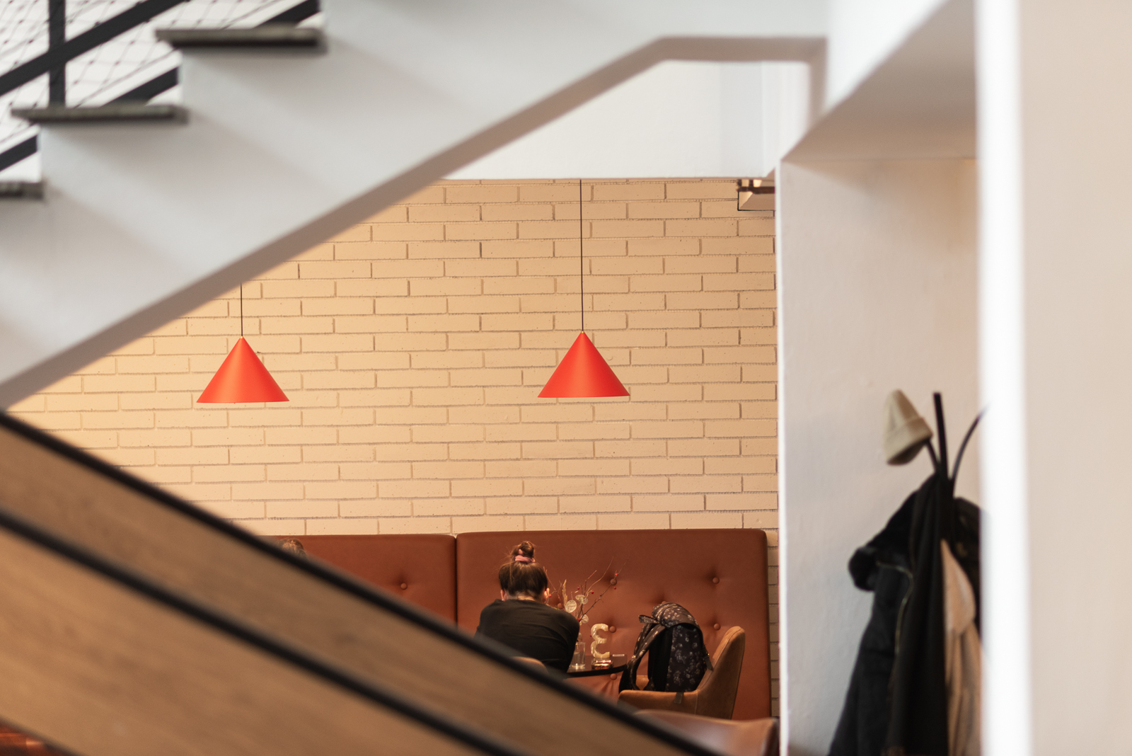 Bar kavárníci z Rebelbean společně s architekty situovali do horního patra: „Vejdete do prostoru a je to první vhodné místo, které zároveň nezakrývá okno ven. Takto okno stále funguje jako nositel světla a mohou u něj sedět hosté. Naší snahou bylo vytvořit dost místa na to, aby hosté mohli při vstupu do kavárny nějakým způsobem rotovat. A když se podíváte, zrovna teď to jde krásně vidět. Někdo stojí u schodiště, někdo u baru, jiný si teprve čte nabídku. Funguje to jako náměstí a jedině tato dispozice to umožňovala,” vysvětluje Jan Špalek.