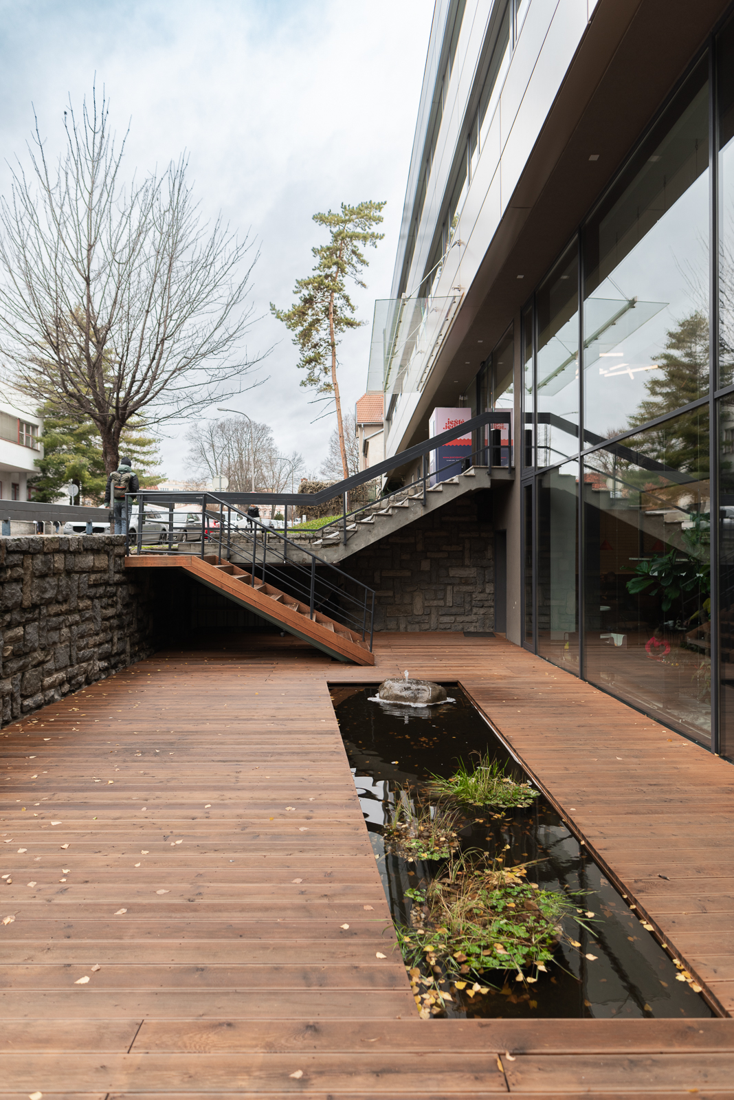 Architekti dále pozměnili dispozice ve spodním patře, kde propojili zázemí a také vytvořili novou místnost pro cowork. Společně s úpravou interiéru je nově zprovozněný i vstup přes zahrádku nacházející se pod úrovní ulice. Zahrádka prošla kompletní kultivací, a to jak její povrch, tak jezírko. Rozbitý beton nahradila dřevěná prkna, jezírko je teď plně funkční a osázené vodními rostlinami.