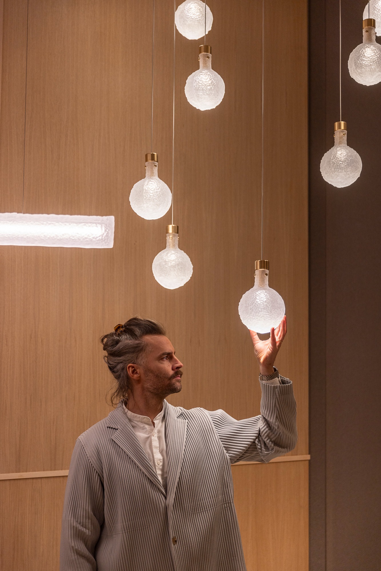 Vzdání holdu přírodě uzavírá shluk kapek Herbarium Radiant s delikátní kresbou uvnitř. Právě otisk jemných rostlin do skla nejenže uchová jejich podobu, zároveň se postará také o něžnou hru odstínů a měnícího se světla. Koncept navazuje na původní Herbarium, které inovuje.