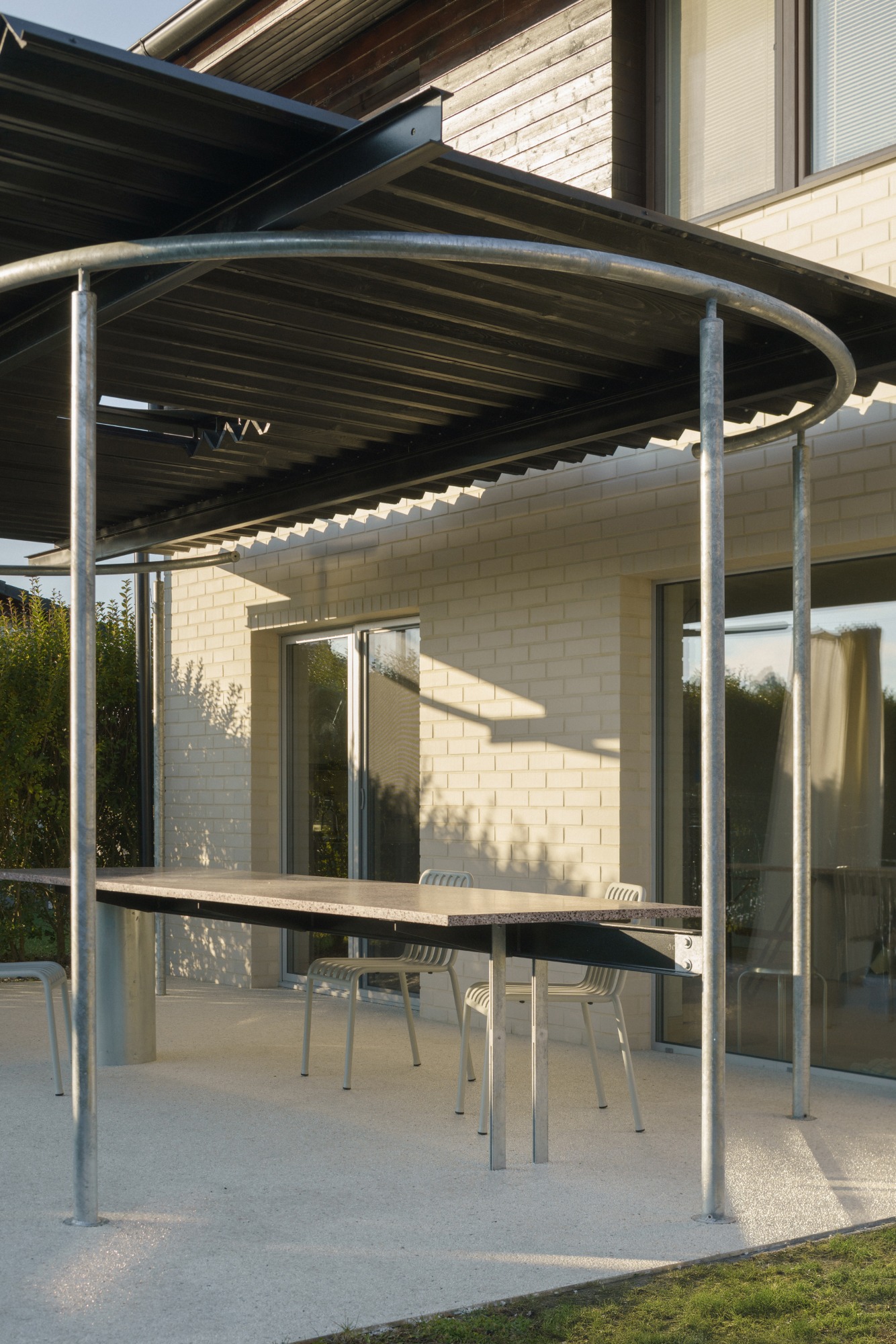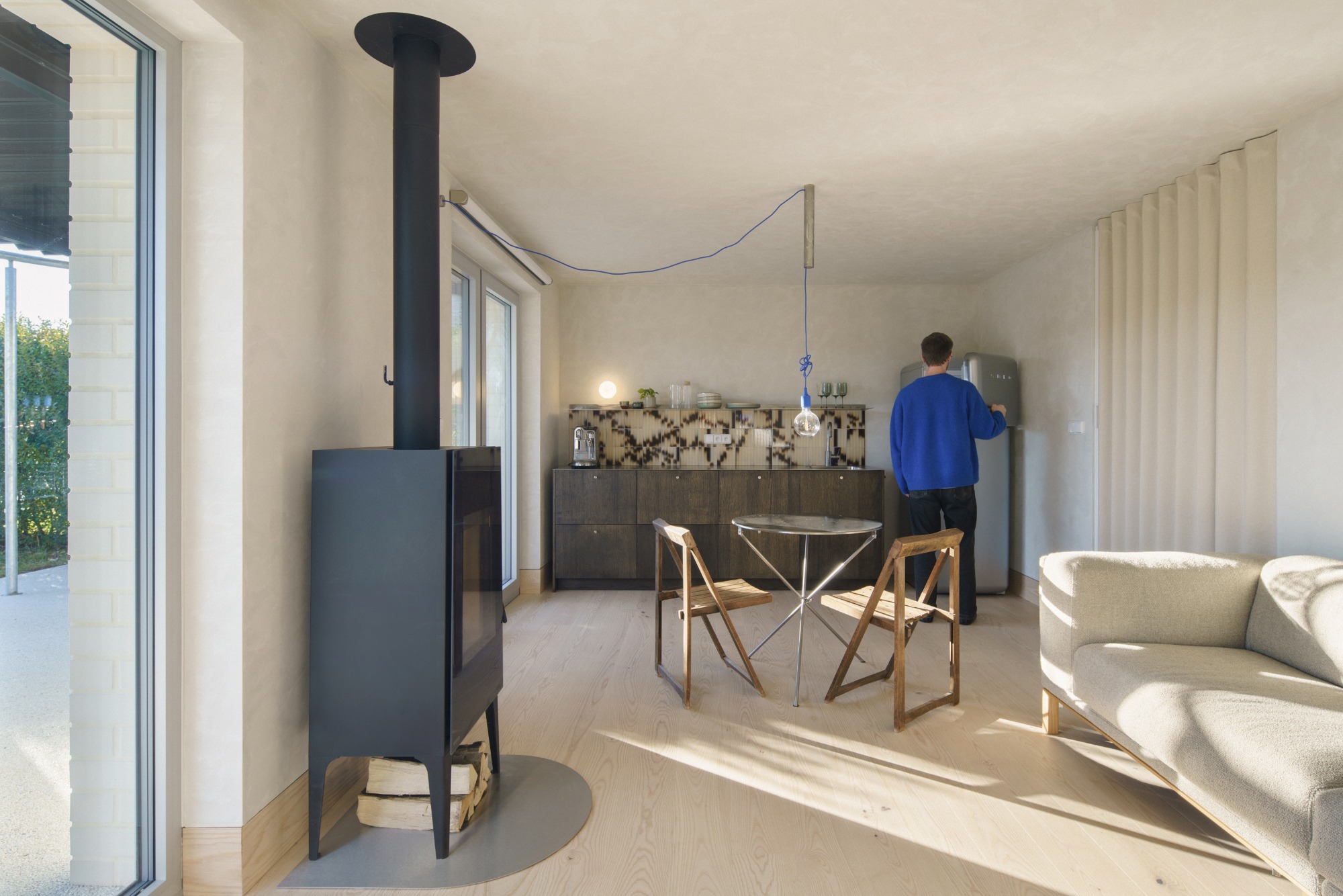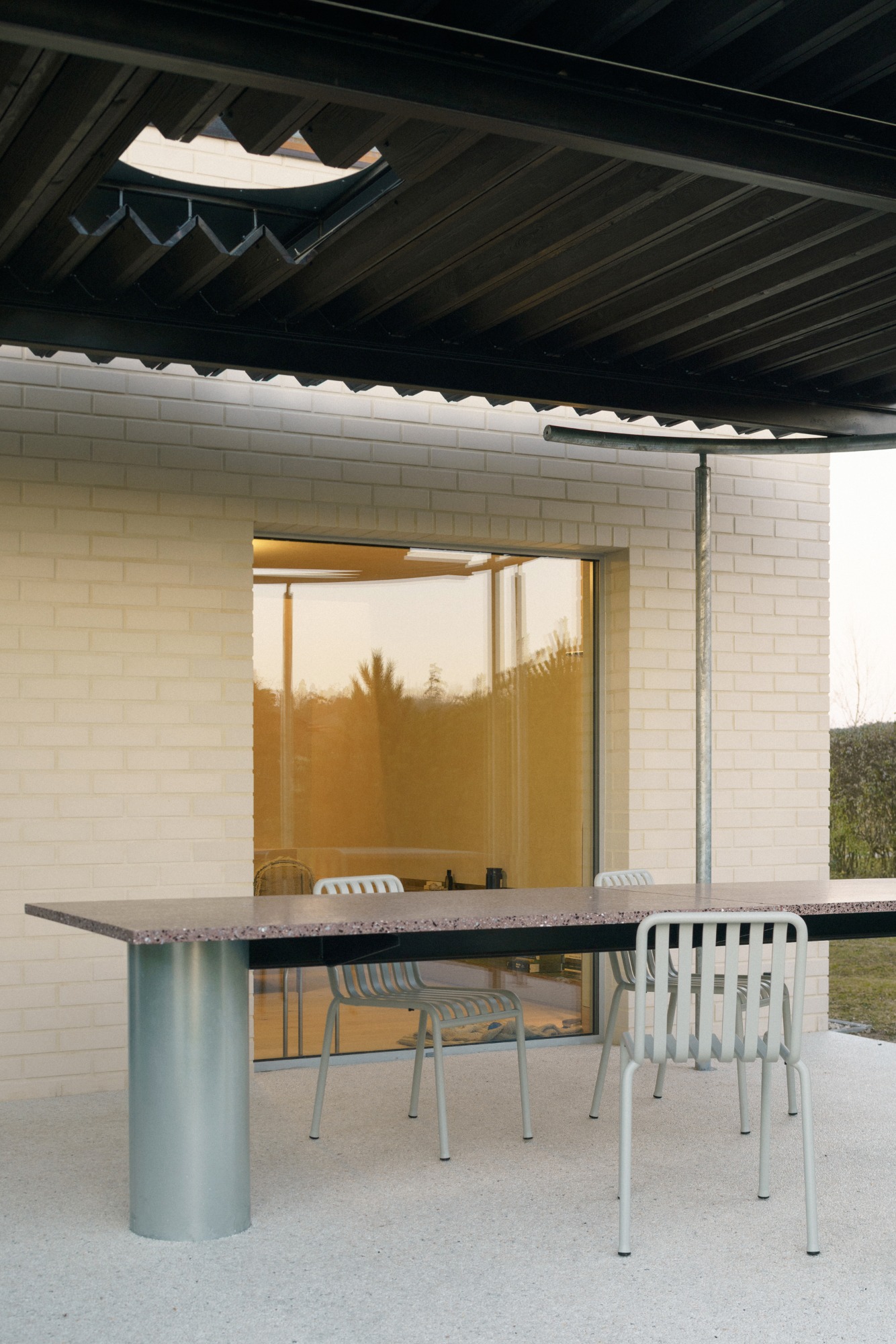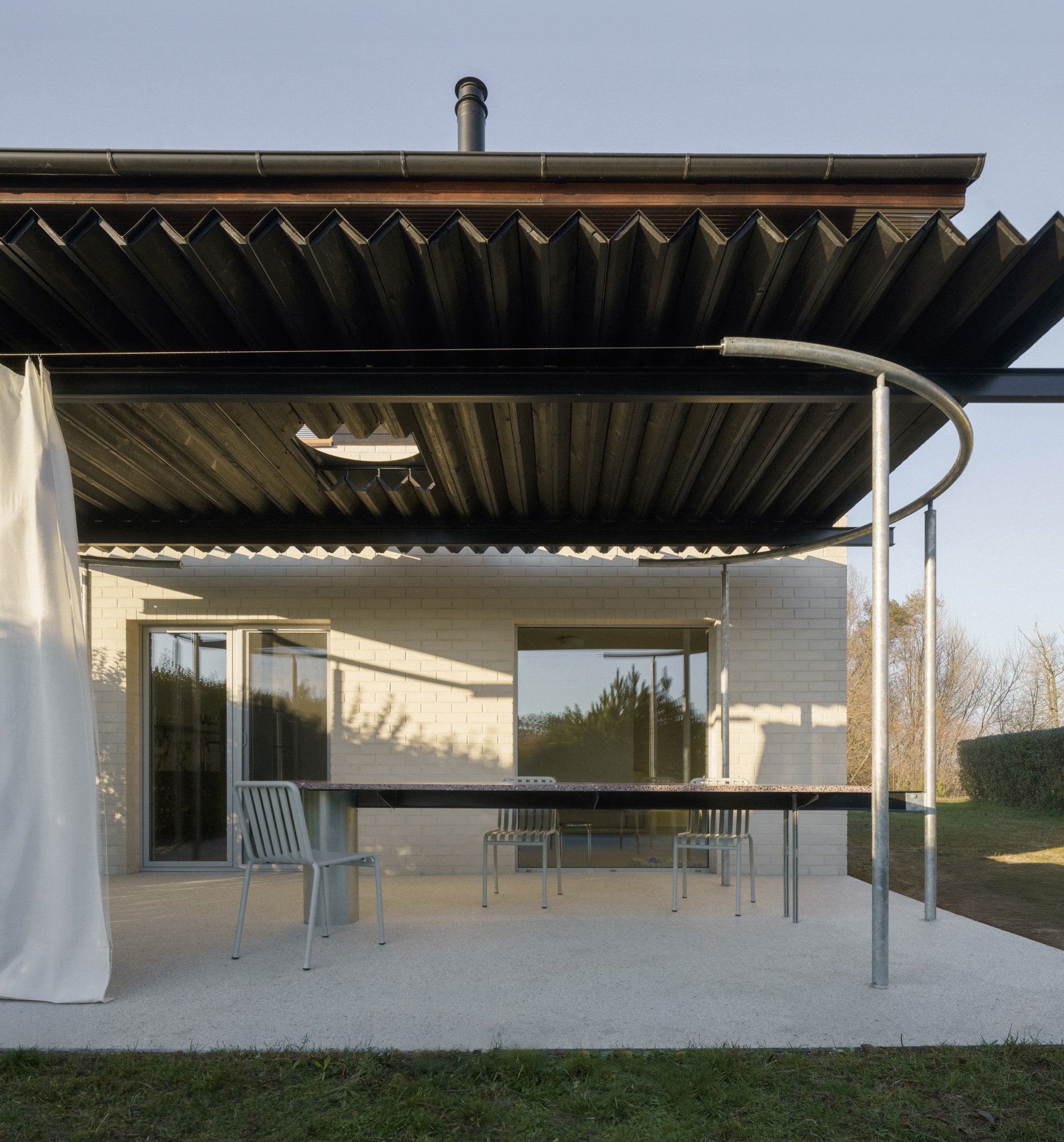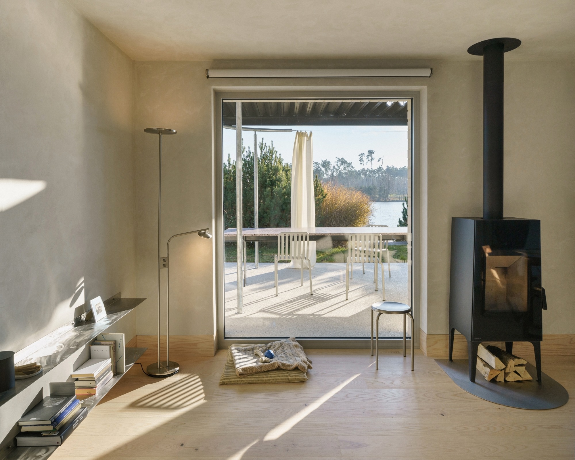 Na terase vznikla nová pergola s lomenou střechou z páleného dřeva, které se objevuje také na fasádě. Do střechy pergoly byl umístěn kruhový otvor, aby denní světlo dopadalo i do interiéru. Měnící se světlo během dne navíc doplňuje tento prvek o zajímavý detail. „Můj nejoblíbenější prvek terasy je však výměna balkonových dveří za velkoformátové okno. Je situované frontálně na sedačku a pokaždé, když na ní sedíte, máte pocit, že se díváte na obraz. Výhled na jezero a les je neskutečný,“ vylíčil architekt s připomenutím, že na tak malém půdorysu existují vstupy na terasu hned dva, a proto si mohl dovolit jeden zrušit.