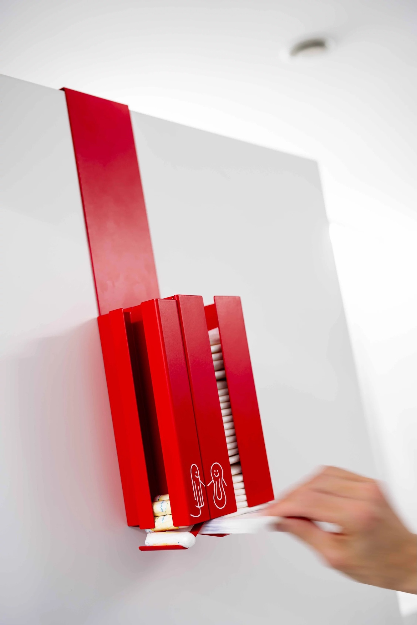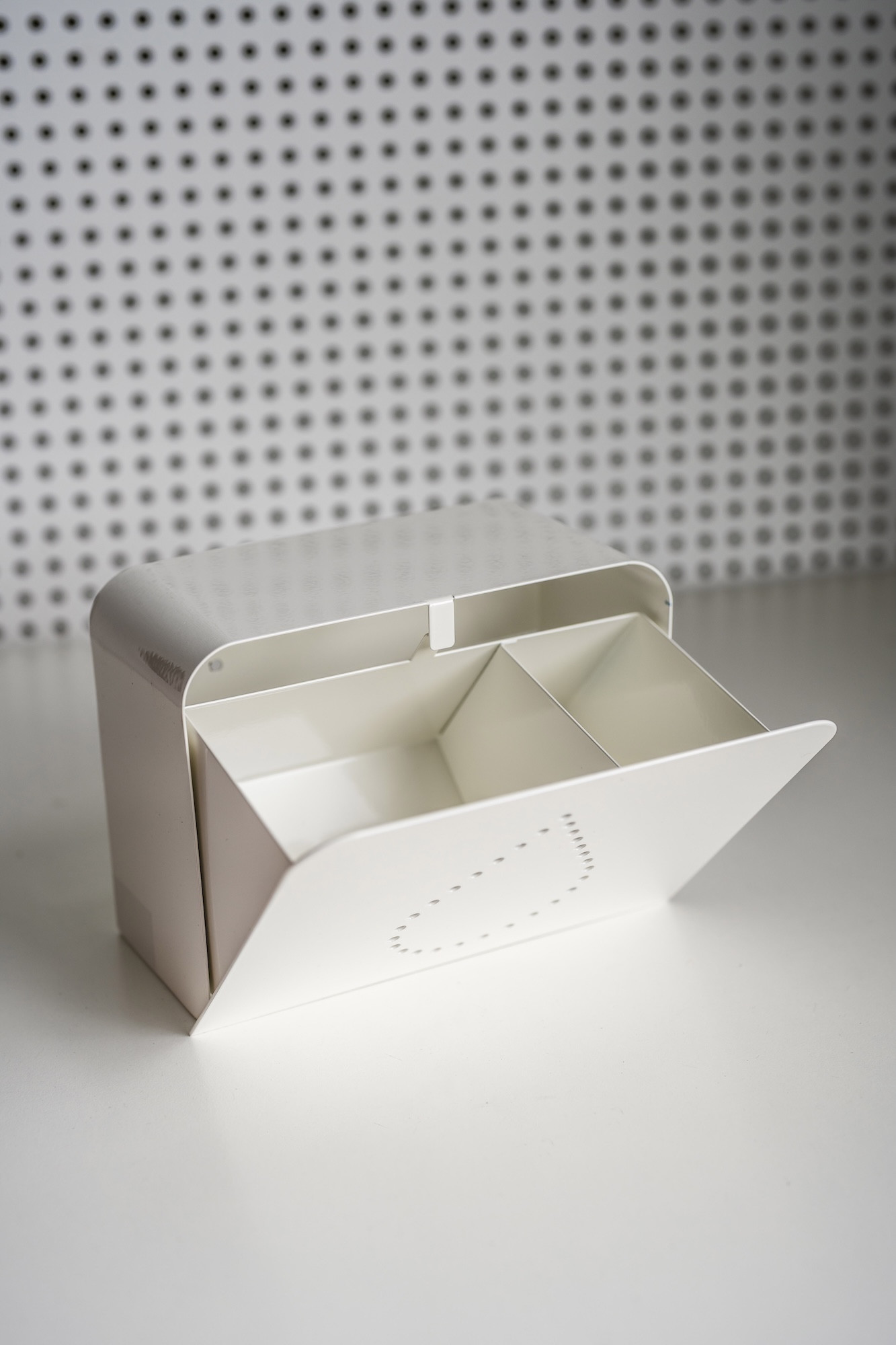 Zásobník navržený Pavlínou Polákovou splňuje hned několik priorit, které si vytyčila. Především je finančně nenáročný na výrobu, což umožní jeho široké použití. Funguje jako výklopný šuplík s perforovaným předním dílem. Otvory jednak diskrétně označují, co v zásobníku očekávat, zároveň slouží k vizuální kontrole jeho kapacity. Dá se omýt, snadno doplnit, lze jej přivrtat nebo přilepit.