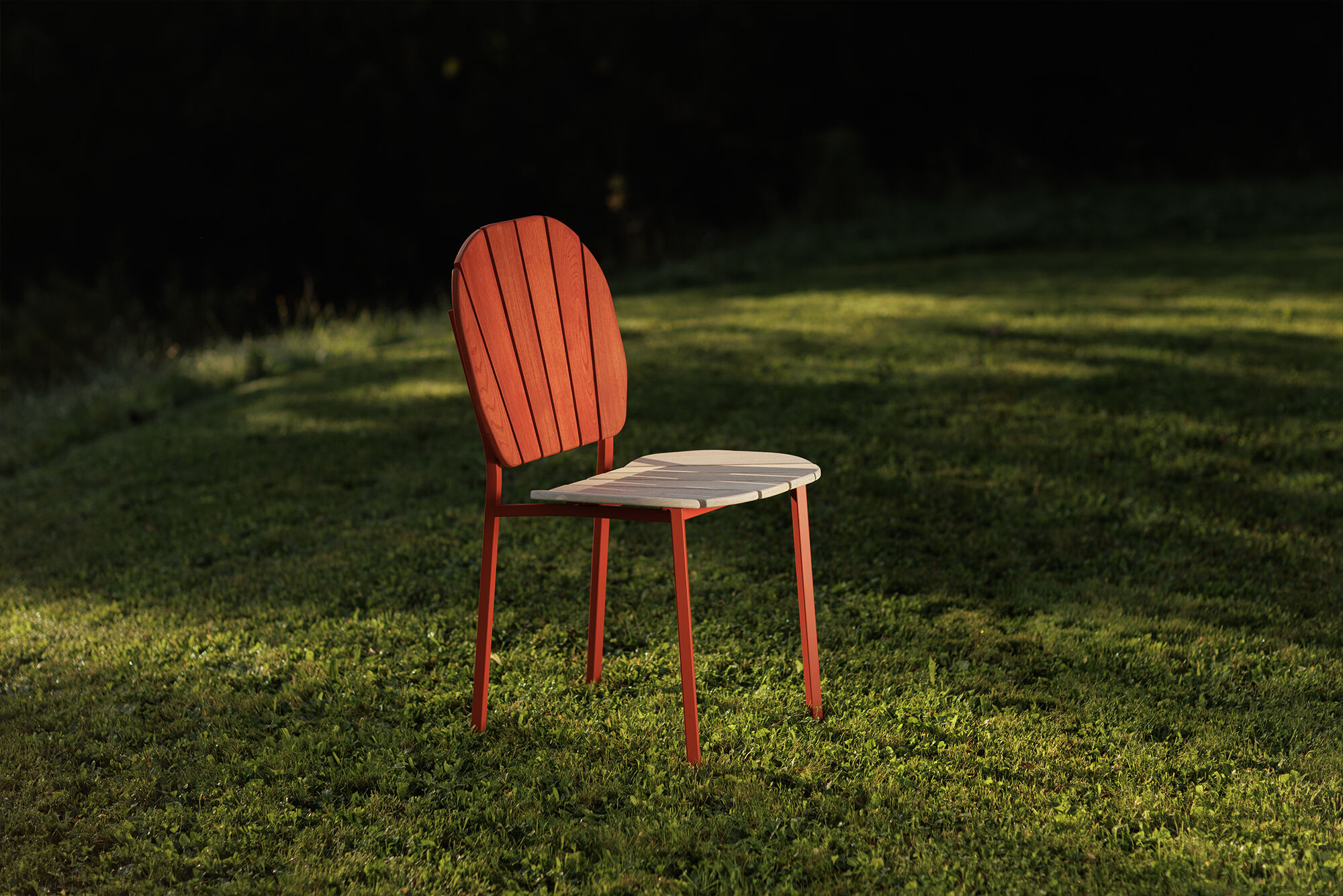 Tvarosloví sedáku i opěráku kolekce Bombshell vychází z mušle – latě jsou vějířovitě rozprostřeny na subtilní, odolné kovové konstrukci, opticky tak vytváří dojem zrcadlení nebo otevřené lastury. Oblé hrany a mírné natočení působí jemným dojmem, který je podtržený hřejivým charakterem dřeva, v tomto případě akátového. Design židlí a stolu je nevtíravý, ale elegantní. Základní barevnost je zvolená tak, aby dobře ladila se zelení, na zakázku je možné nábytek barevně přizpůsobit.